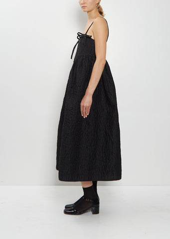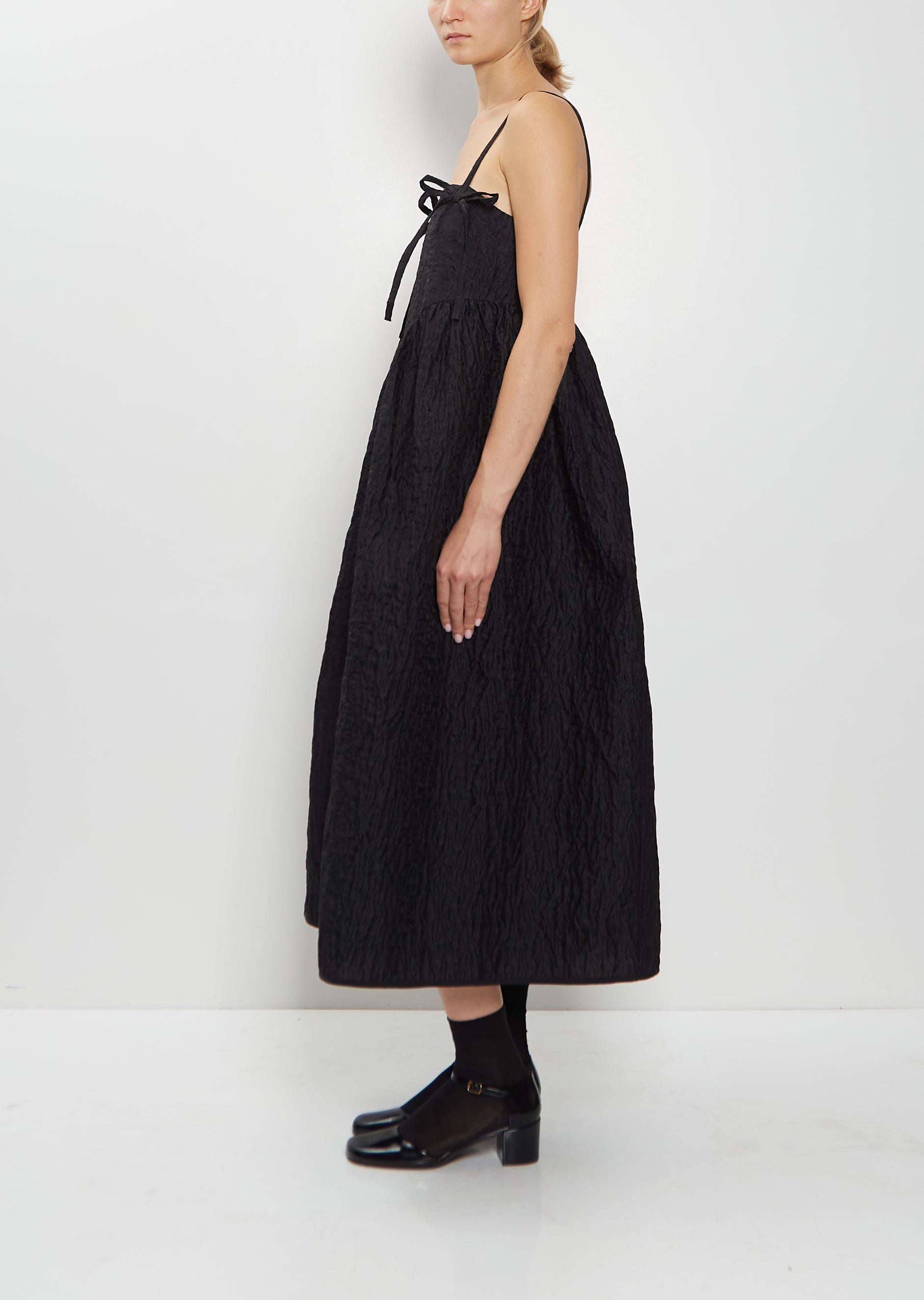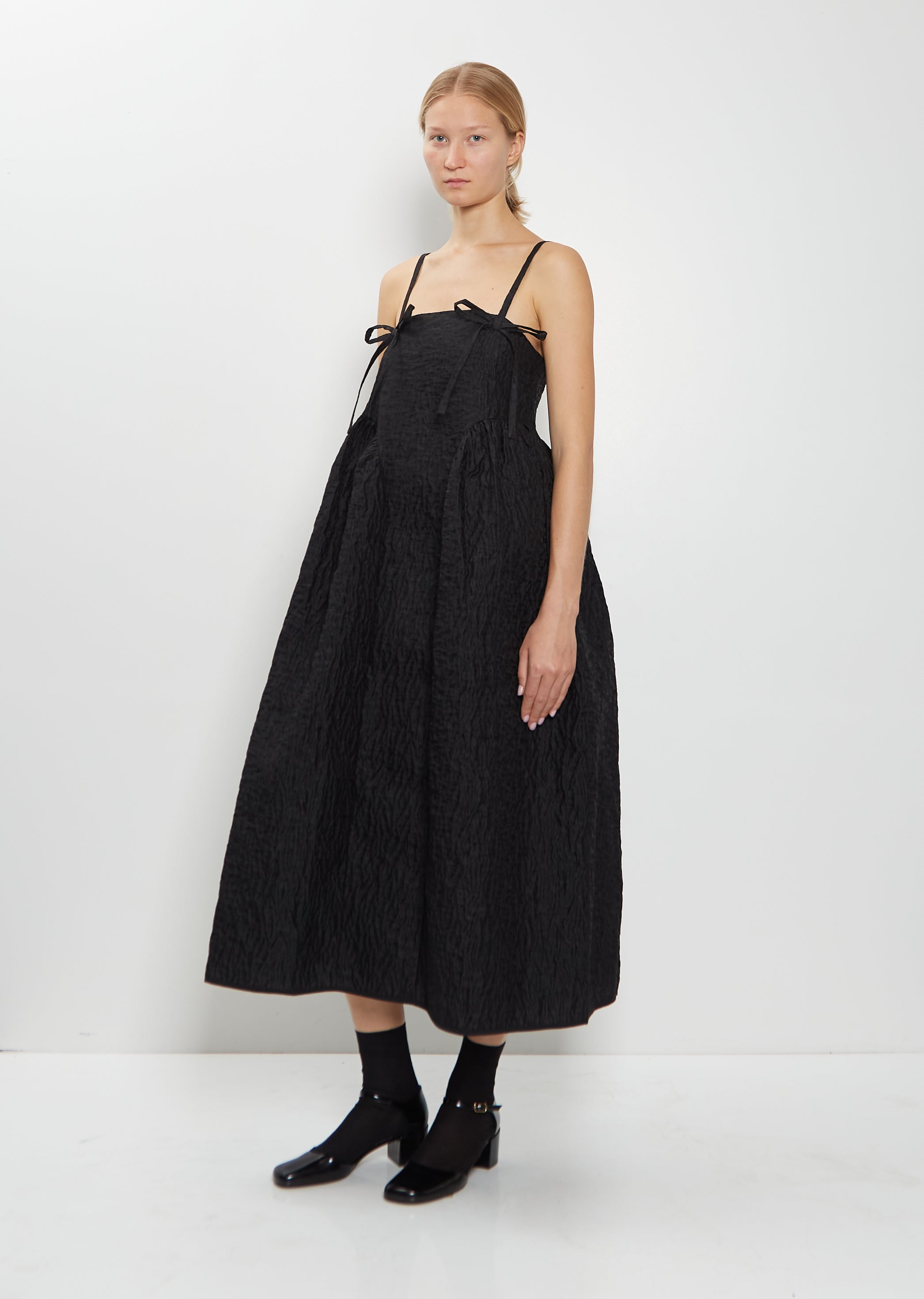 Cecilie Bahnsen black A-line strap dress with a straight neckline in poly silk blend matelassé fabric with a floral pattern. Features side gathered hip panels, bow detail at thin straps, and a hook and eye zip closure at back. Lined in tonal cupro fabric.