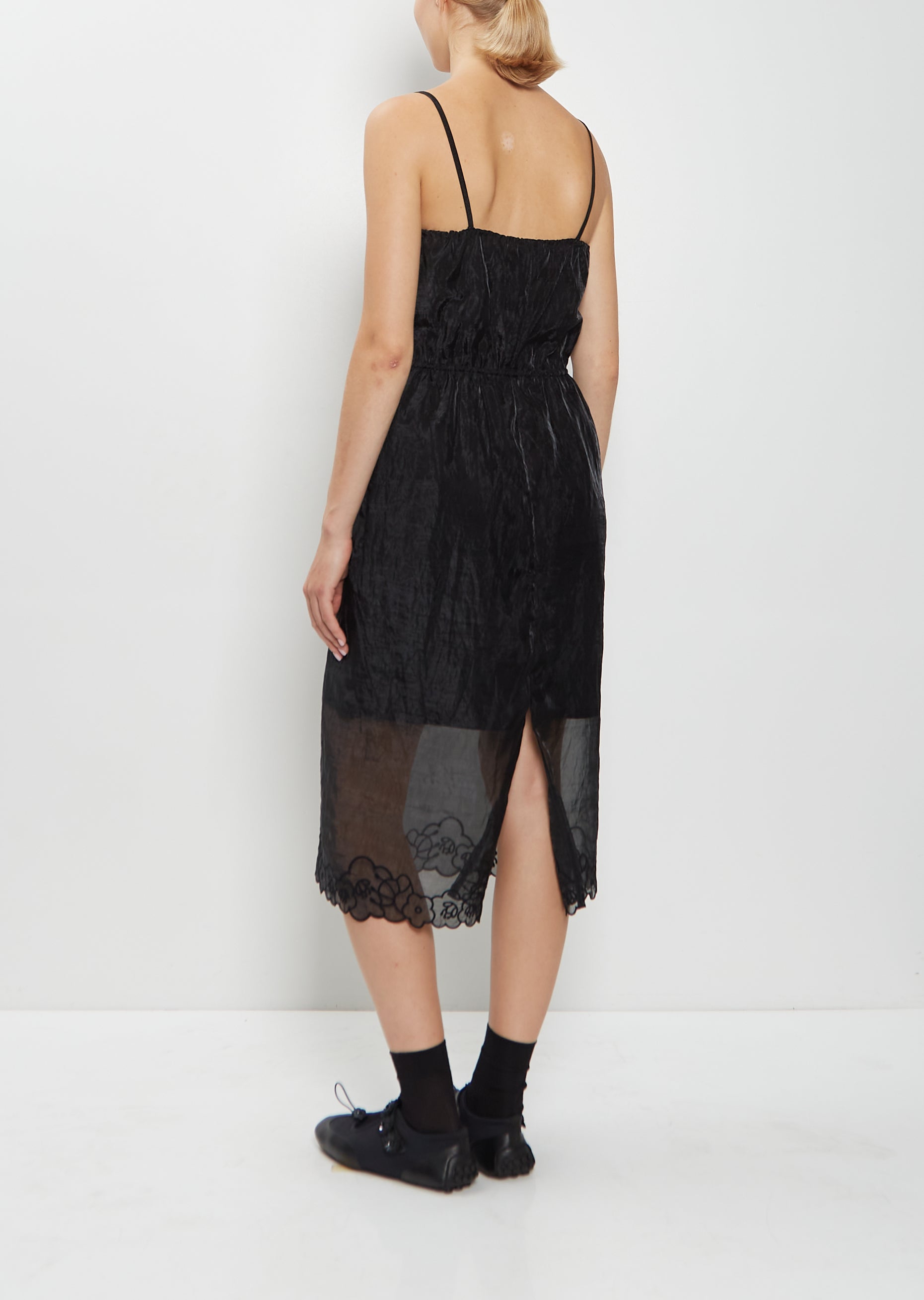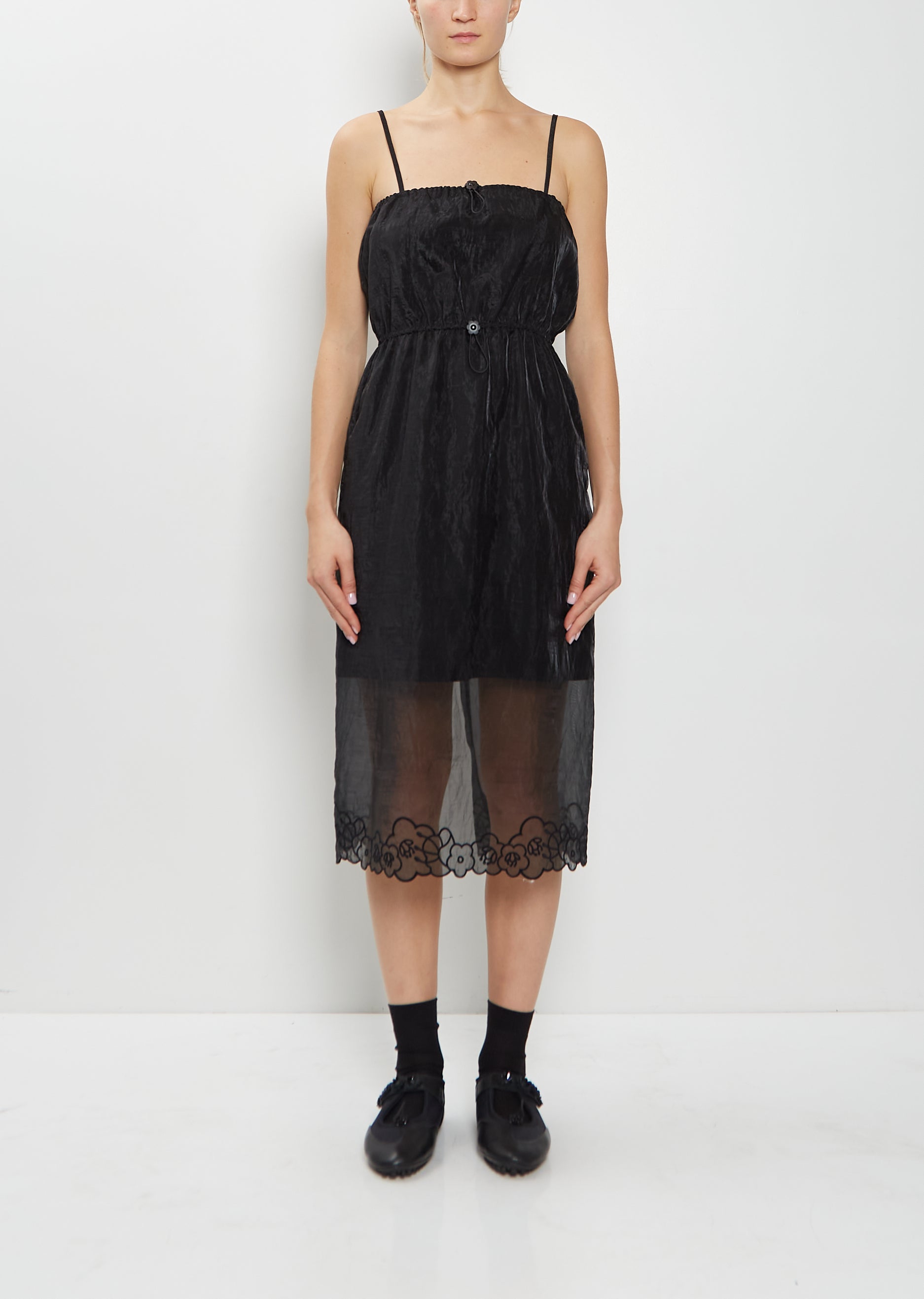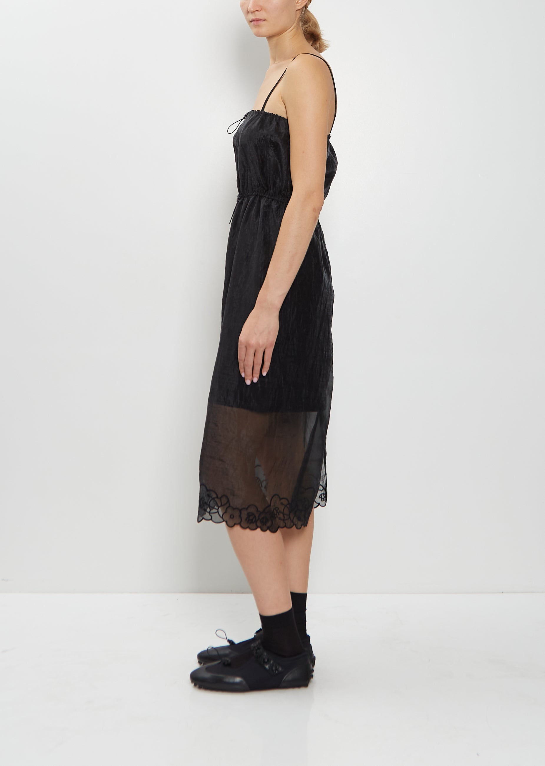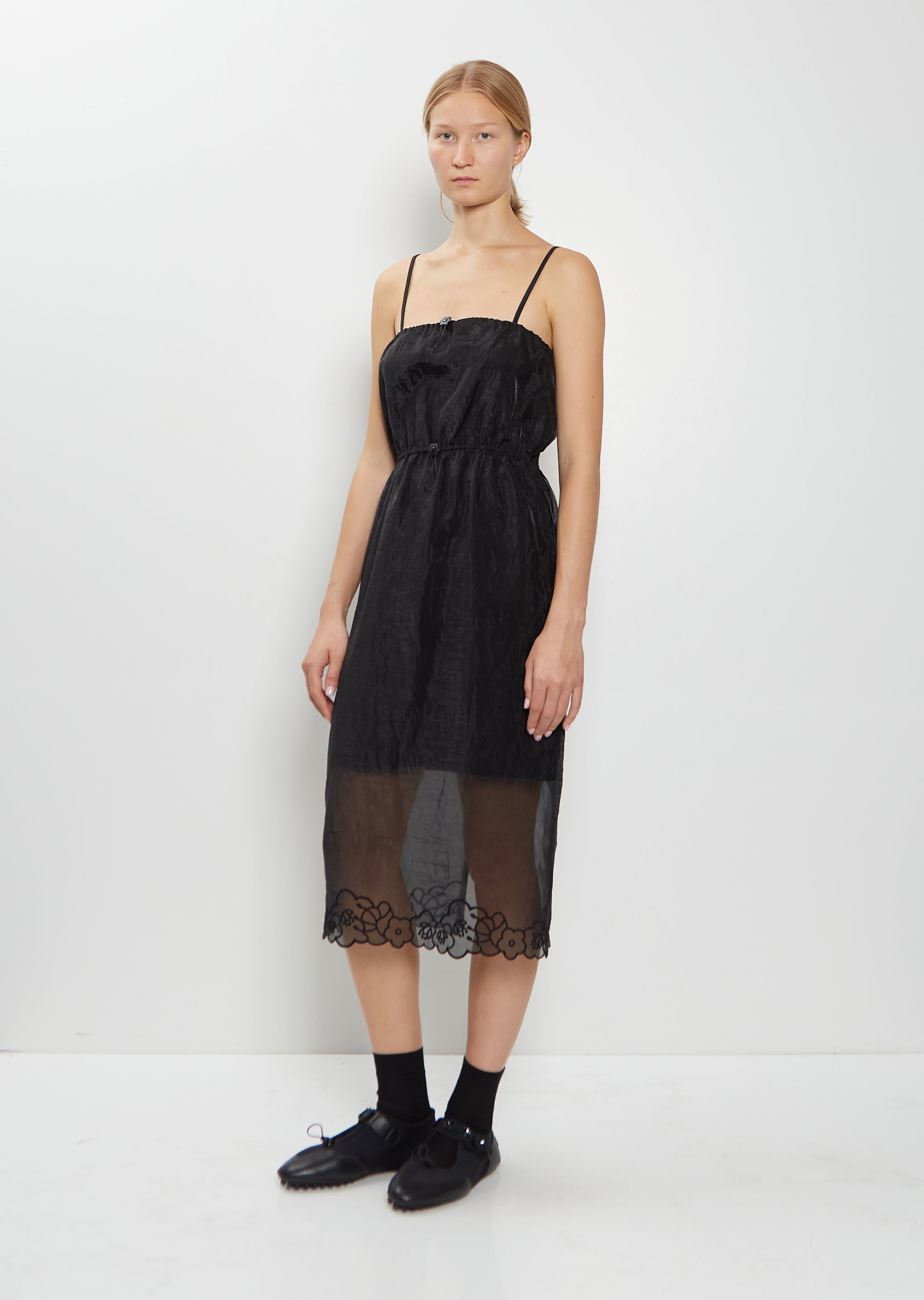 Cecilie Bahnsen black thin strap dress with an elasticated drawcord neckline and waist in sheer liquid myrtia fabric. Features a straight neckline, floral motif drawcords, signature floral motif hem, and slit at center back. Lined in tonal cupro fabric.