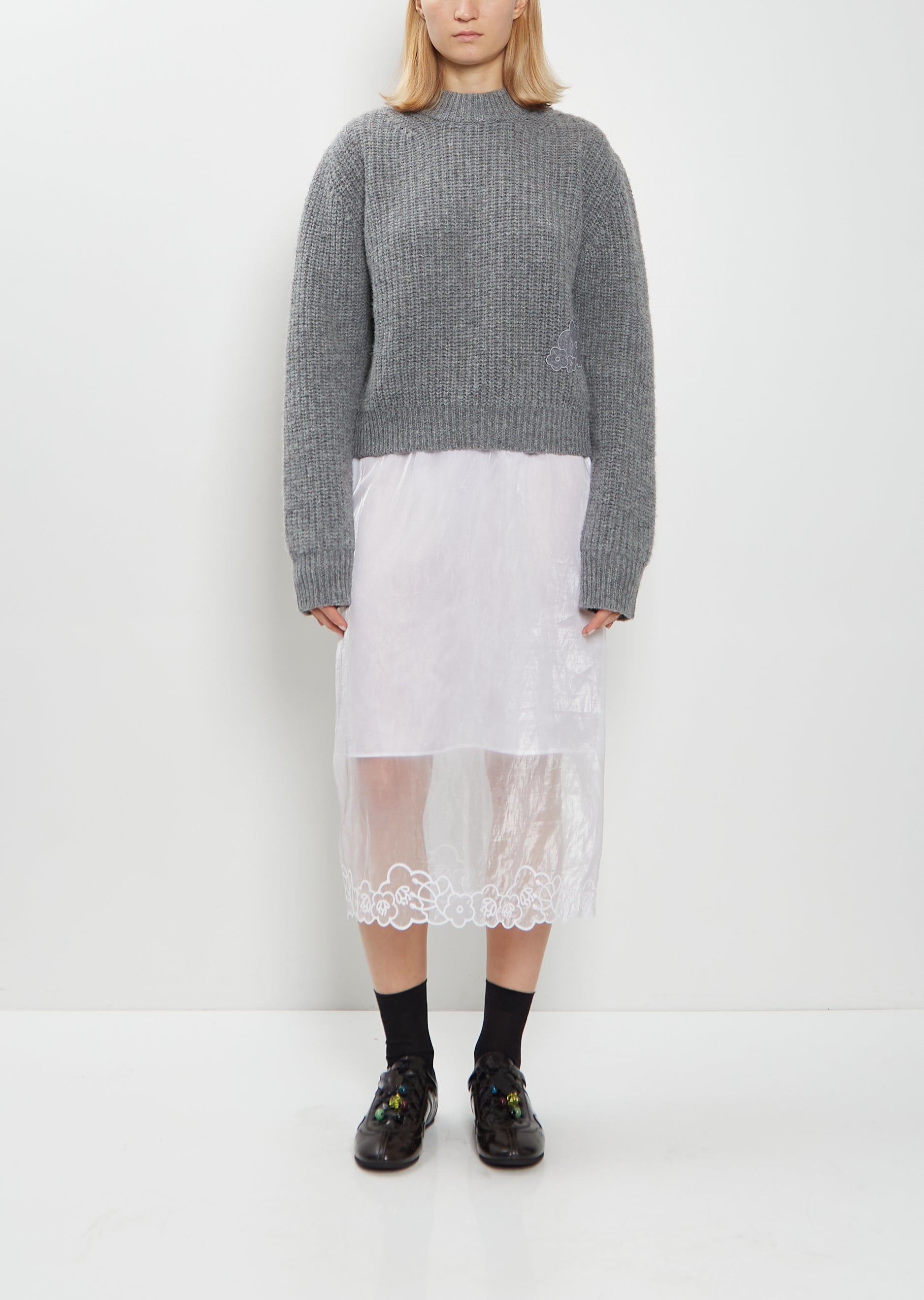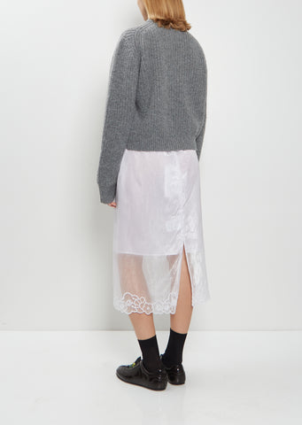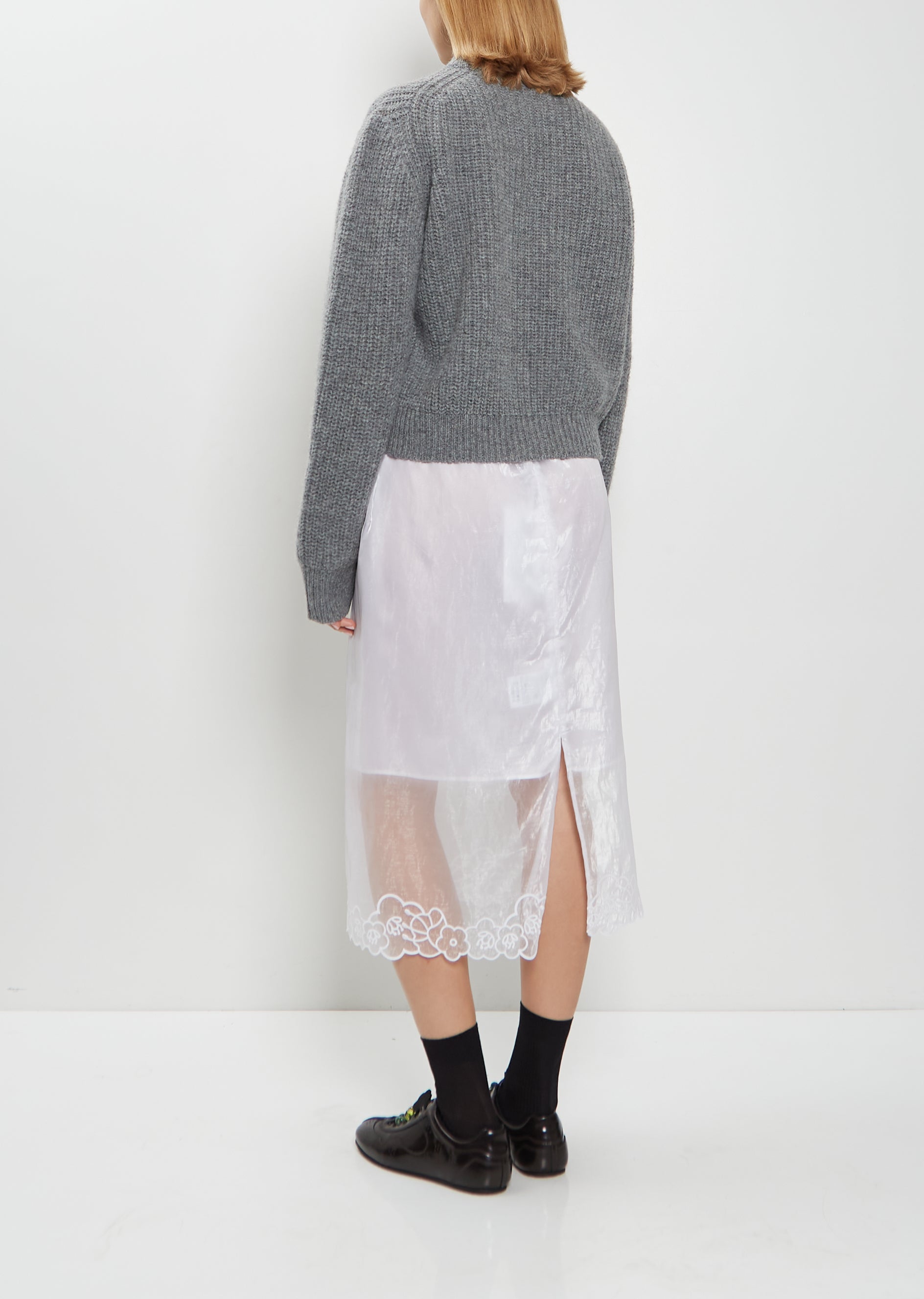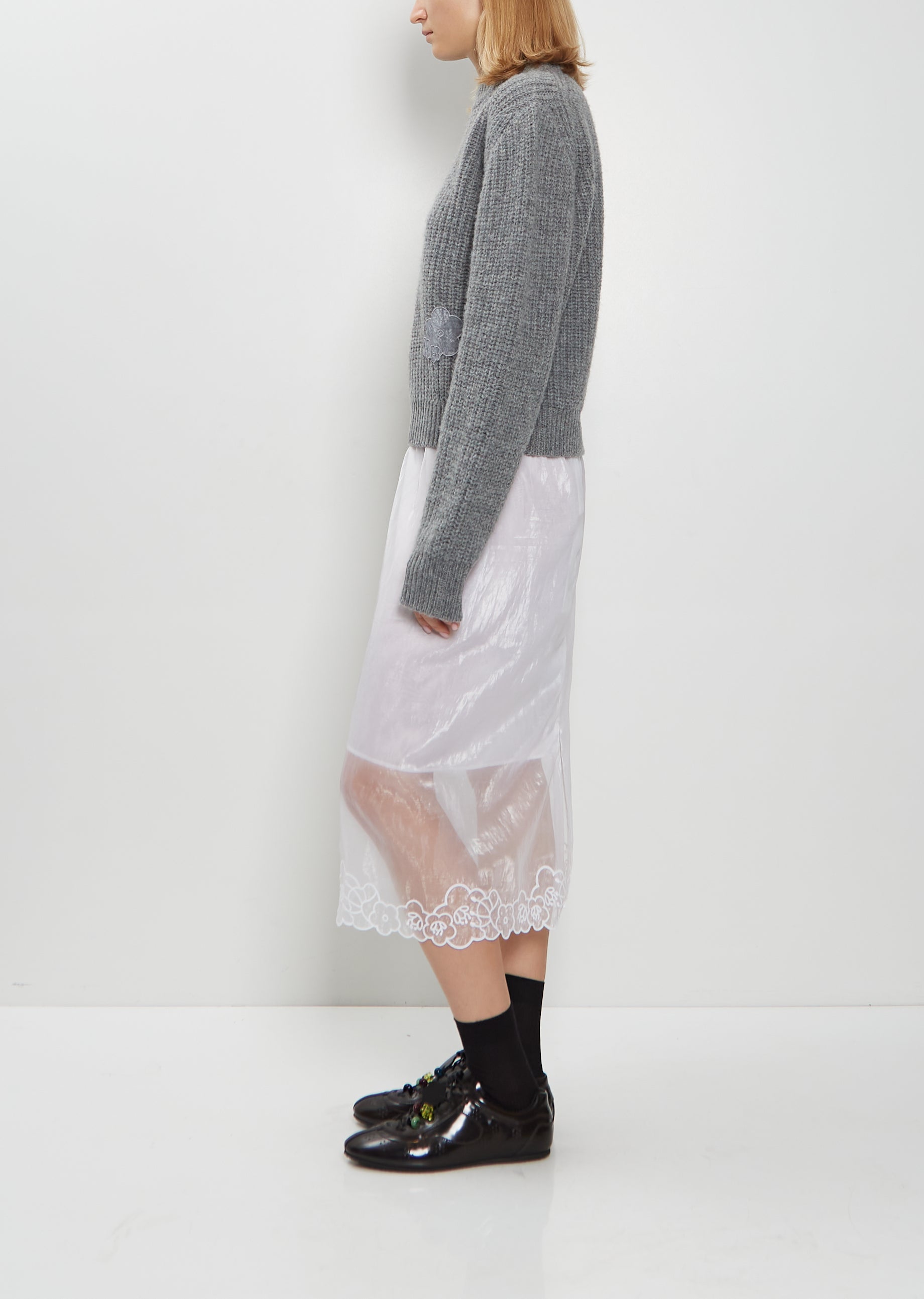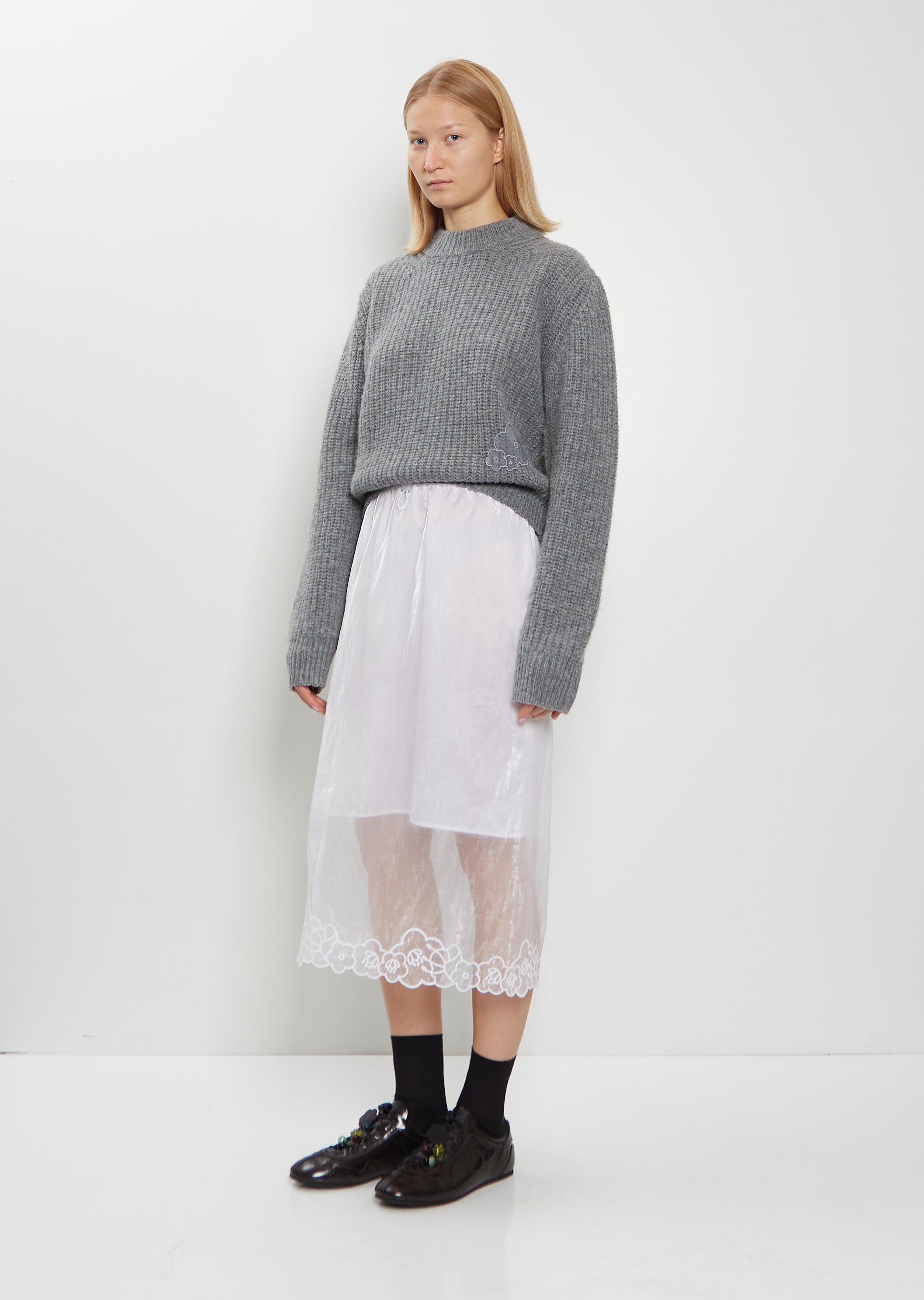 Cecilie Bahnsen white pencil skirt with an elasticated drawcord waist and signature floral motif hem in sheer liquid myrtia. Features floral motif drawcord and slit at back hem. Lined in tonal cupro.