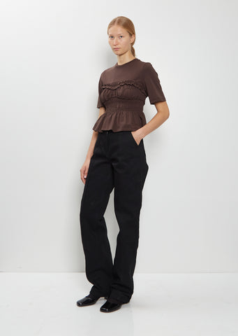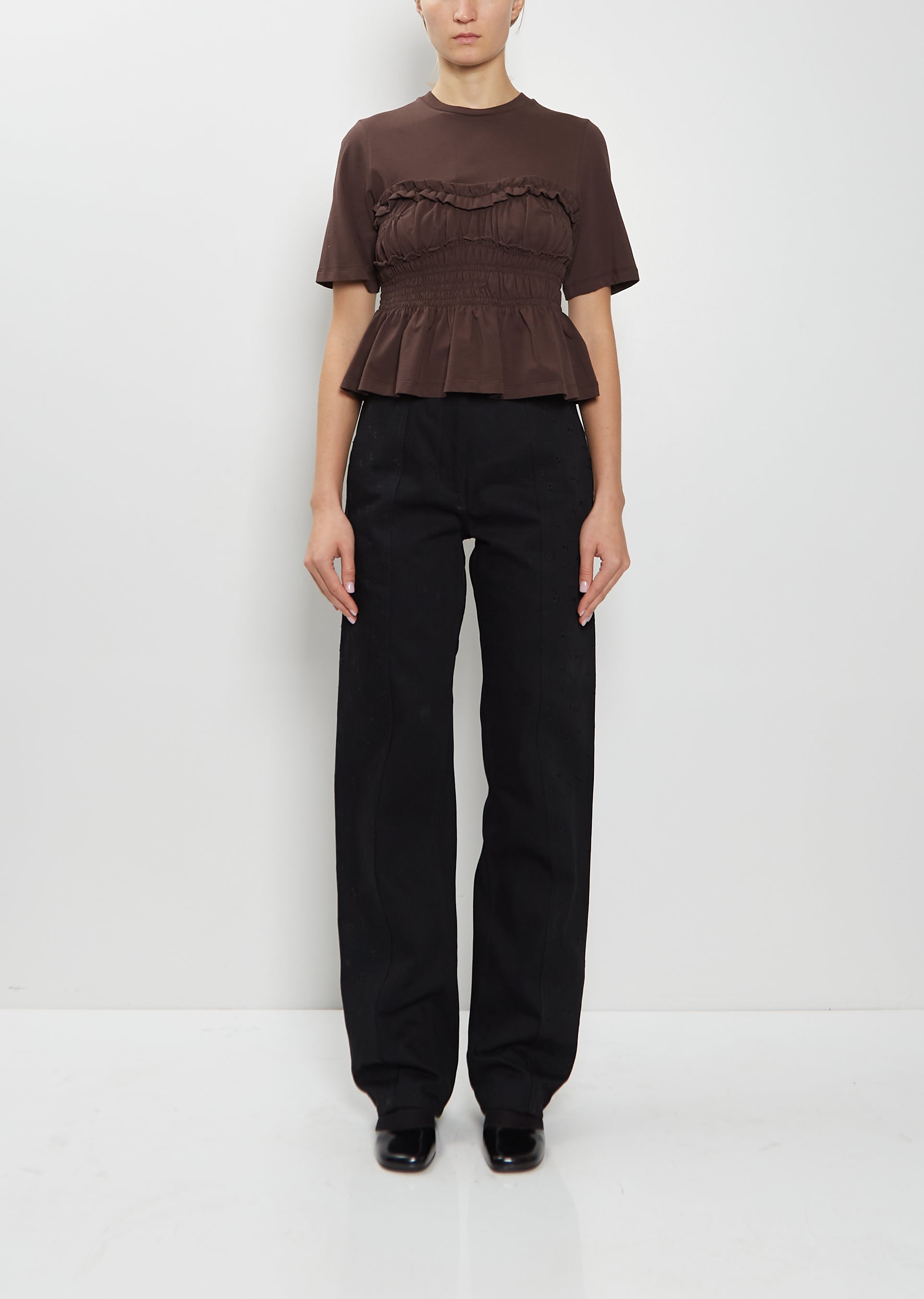 Cecilie Bahnsen black high-waisted trousers with wide, straight legs in dense floral embroidered cotton denim. Features belt loops, 5-pocket construction, signature embroidered floral motifs at back pockets, and a button and zip-fly fastening. Regular fit.