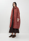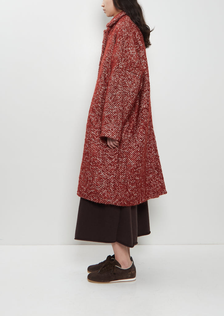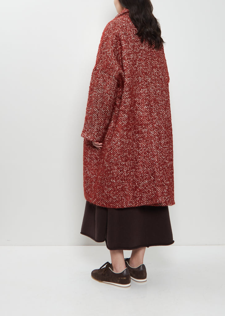 Casey Casey burgundy signature oversized coat in textured and refined mohair and wool blend tweed. Features dropped shoulders, side welt pockets, interior buttoned patch pockets, and high vent at back. Finished with tonal corozo buttons closure at front. Fully lined in ivory cotton fabric.