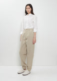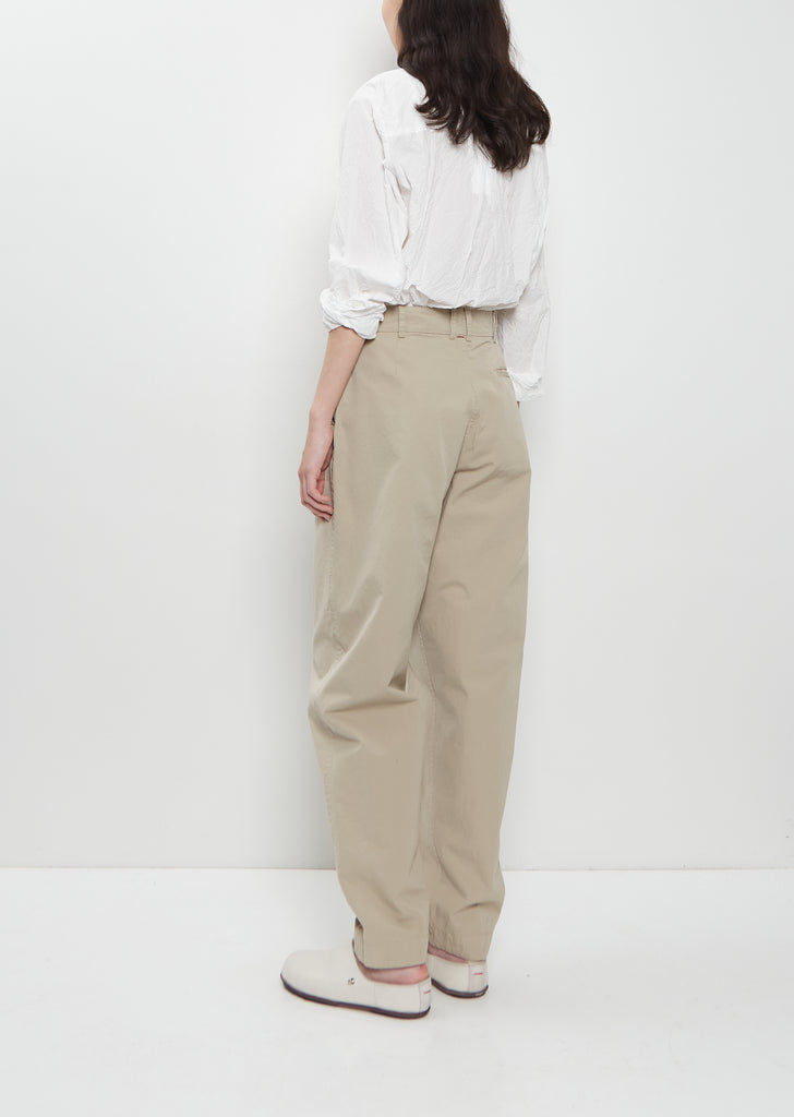 Casey Casey oatmeal beige pants with wide, tapered legs and a pleated front in durable and dense double cotton with a slightly crinkled effect. Features belt loops, angled pockets at sides, a single welt pocket at back and a button and zip-fly fastening.