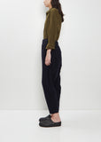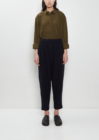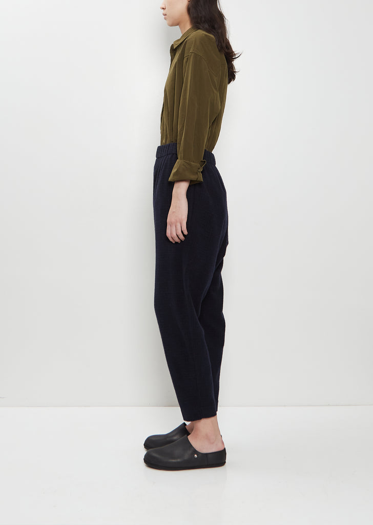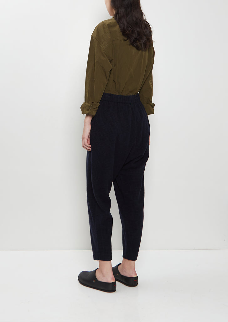 Casey Casey navy blue check cropped pull-on pants with tapered legs in a breathable and soft virgin wool and cashmere blend woven in a textured and subtle pin check. Features an elasticated waistband with an adjustable interior drawstring and angled side pockets. Relaxed fit.