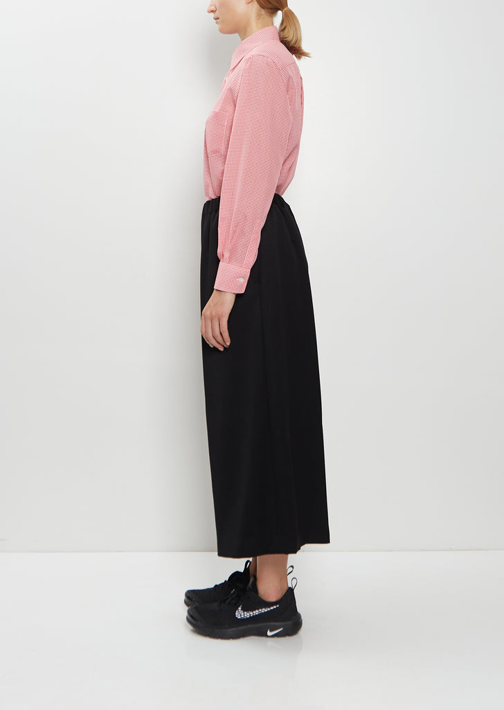 Comme des Garçons Comme des Garçons black pull-on pants with cropped, wide legs and an elasticated waist in wool. Features an interior adjustable drawstring at waist and side seam pockets.