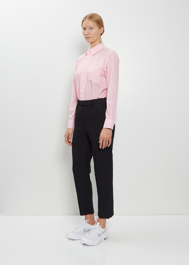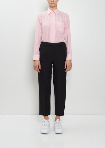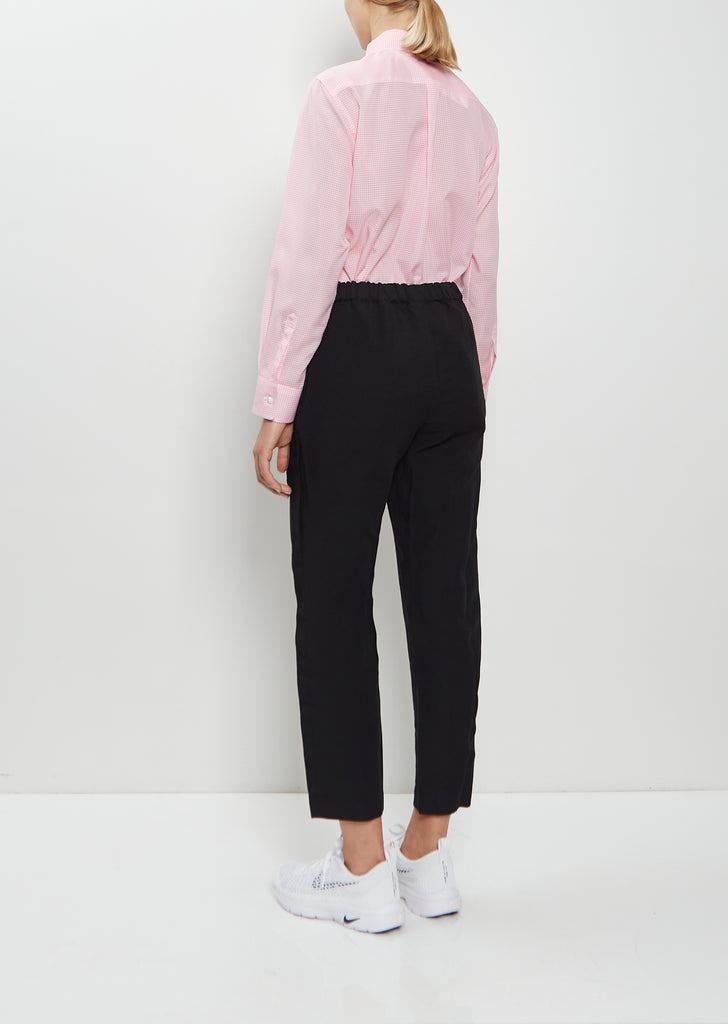 Comme des Garçons Comme des Garçons black pull-on pants with cropped, tapered legs and an elasticated waist in twill with a crinkle effect. Features an interior adjustable drawstring at waist and side seam pockets.