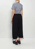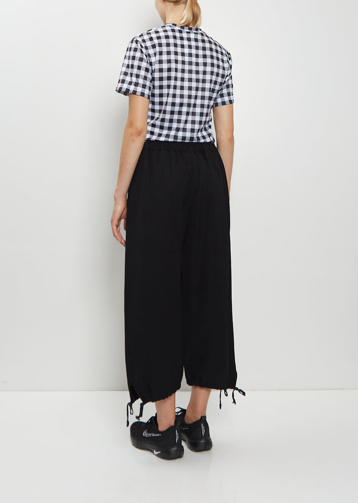 Comme des Garçons Comme des Garçons black pull-on cropped pants with wide legs and adjustable drawstring gathered cuffs in wool gabardine. Features an interior adjustable drawstring at elasticated waist and side seam pockets.