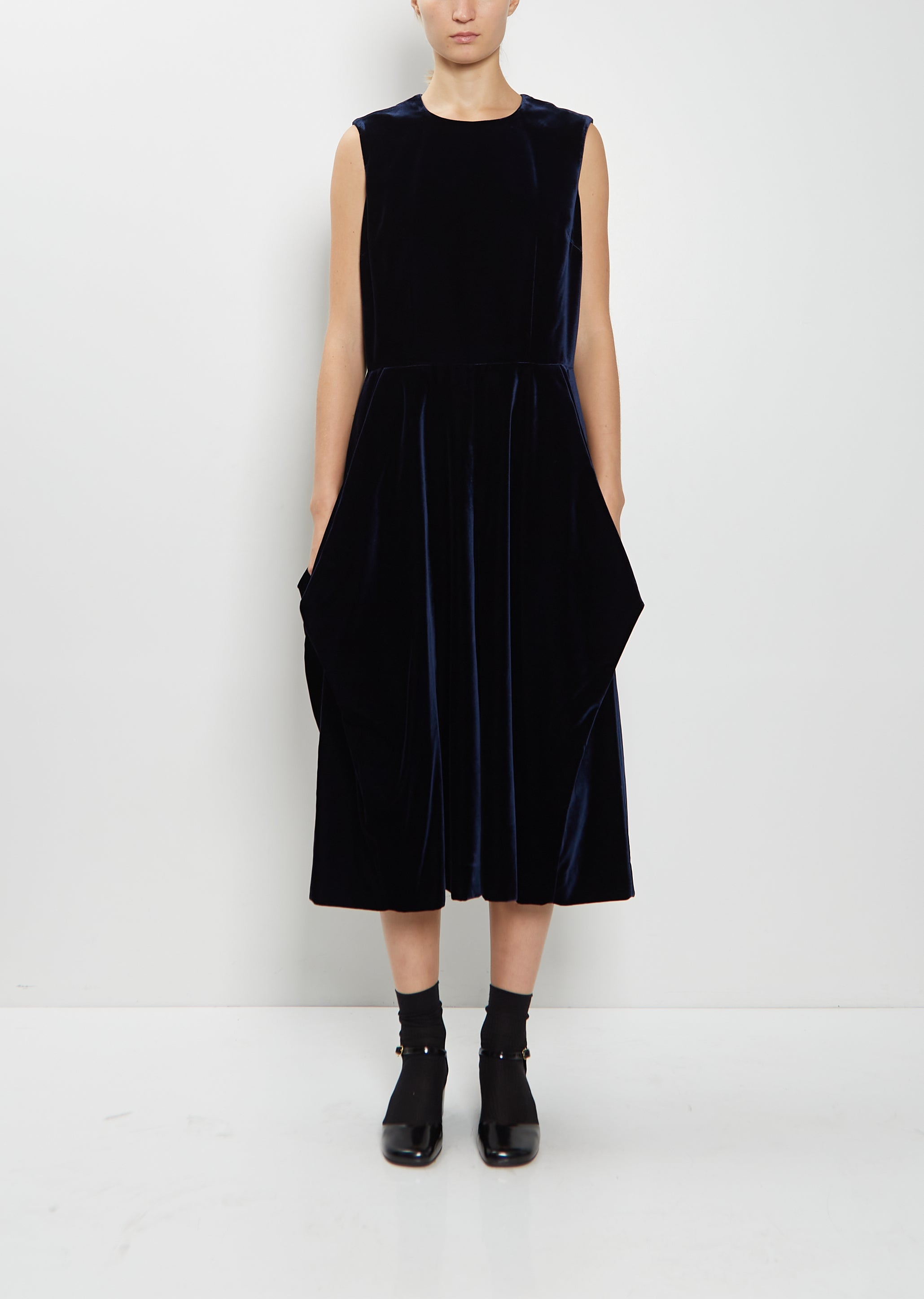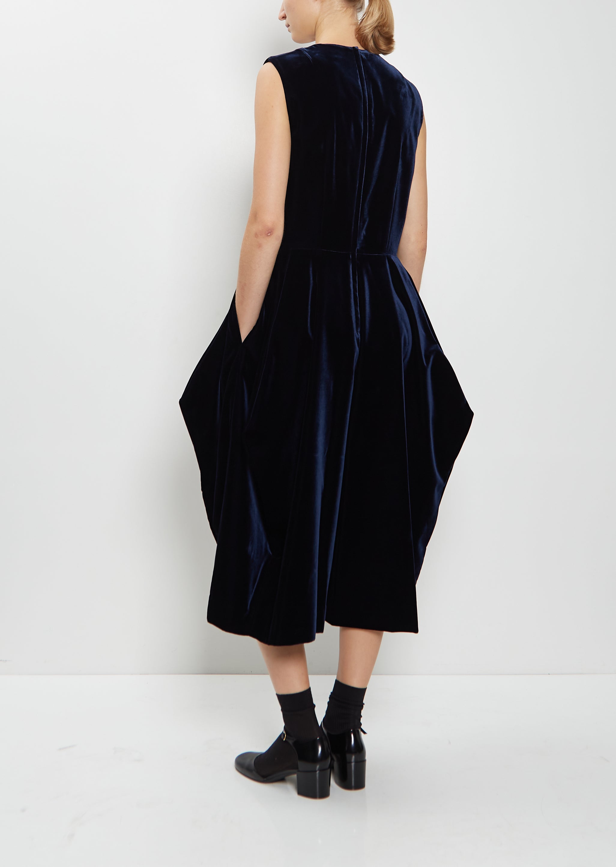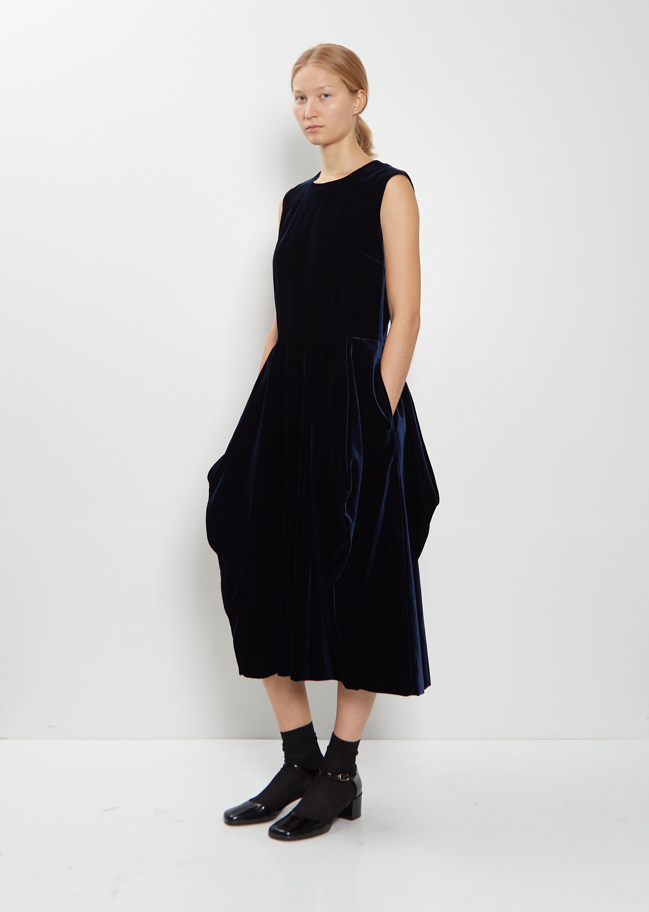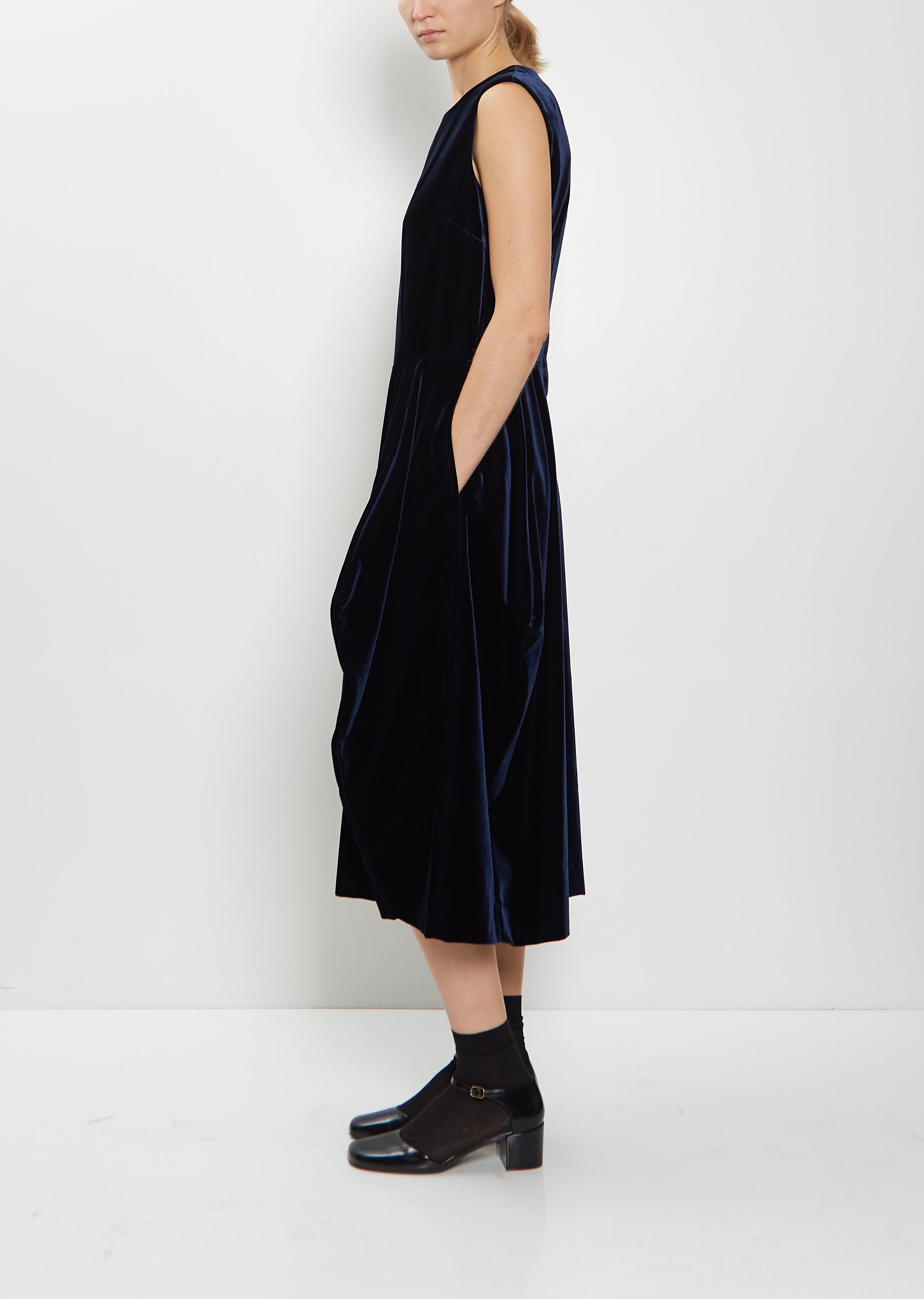 Comme des Garçons navy sleeveless jumpsuit with a round neckline and voluminous pinched details in rayon velvet. Features wide, cropped legs, side seam pockets, and a concealed hook and eye zip closure at back. Lined in black cupro. Pockets lined in off-white cotton.