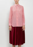 Comme des Garçons red and white checkered shirt with a classic collar and shell-hued button front in lightweight polyester poplin. Features set-in sleeves, a chest patch pocket, buttoned cuffs, slightly curved hem, and box pleat at back yoke. Regular fit.
