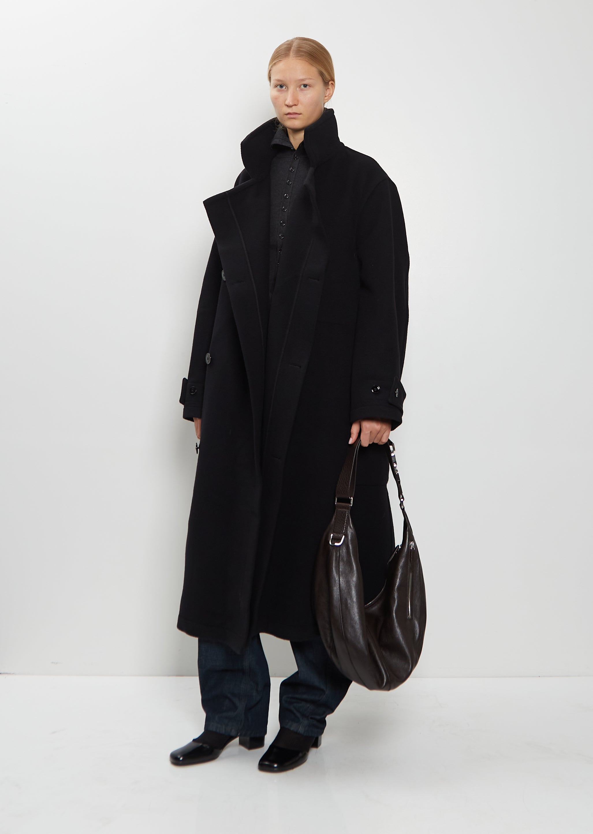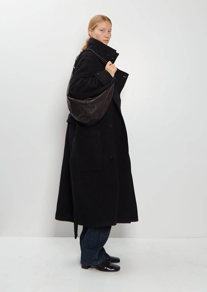 Lemaire dark chocolate bag with an adjustable snap hook shoulder strap in vegetable-tanned grained buffalo leather. Features a double top zipper closure and zippered pocket at side. Finished with silver-toned hardware throughout. Can be worn on the shoulder or crossbody.