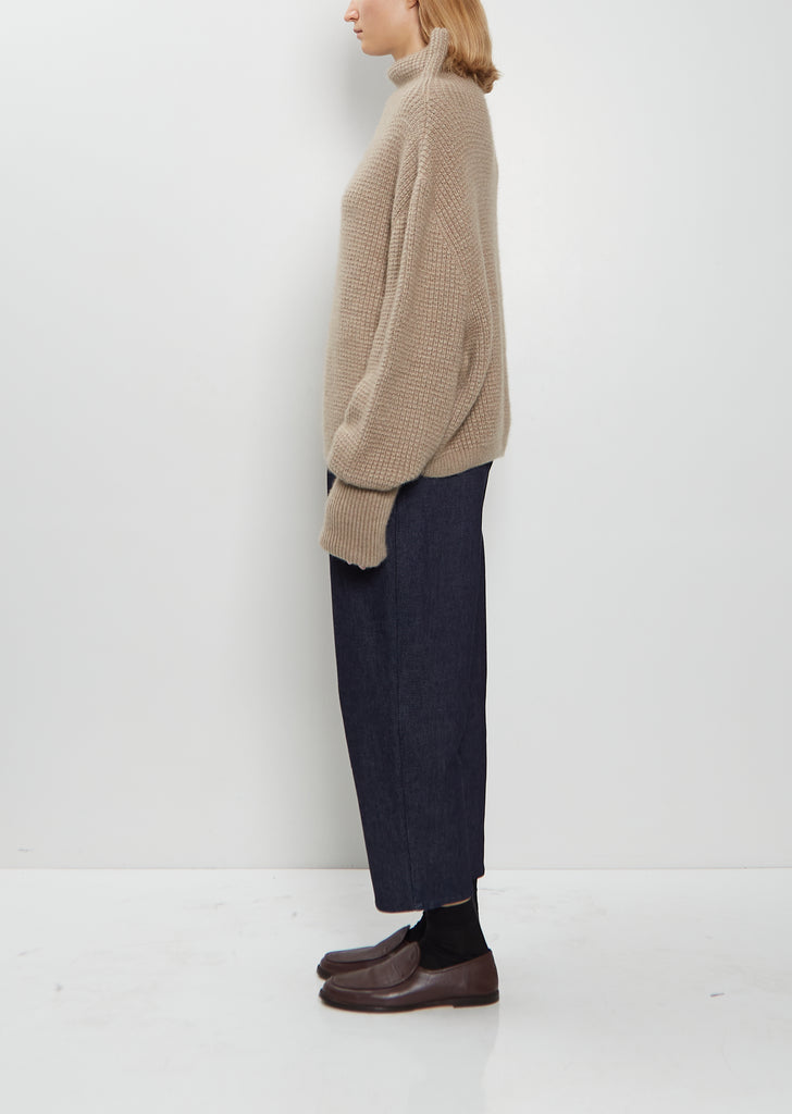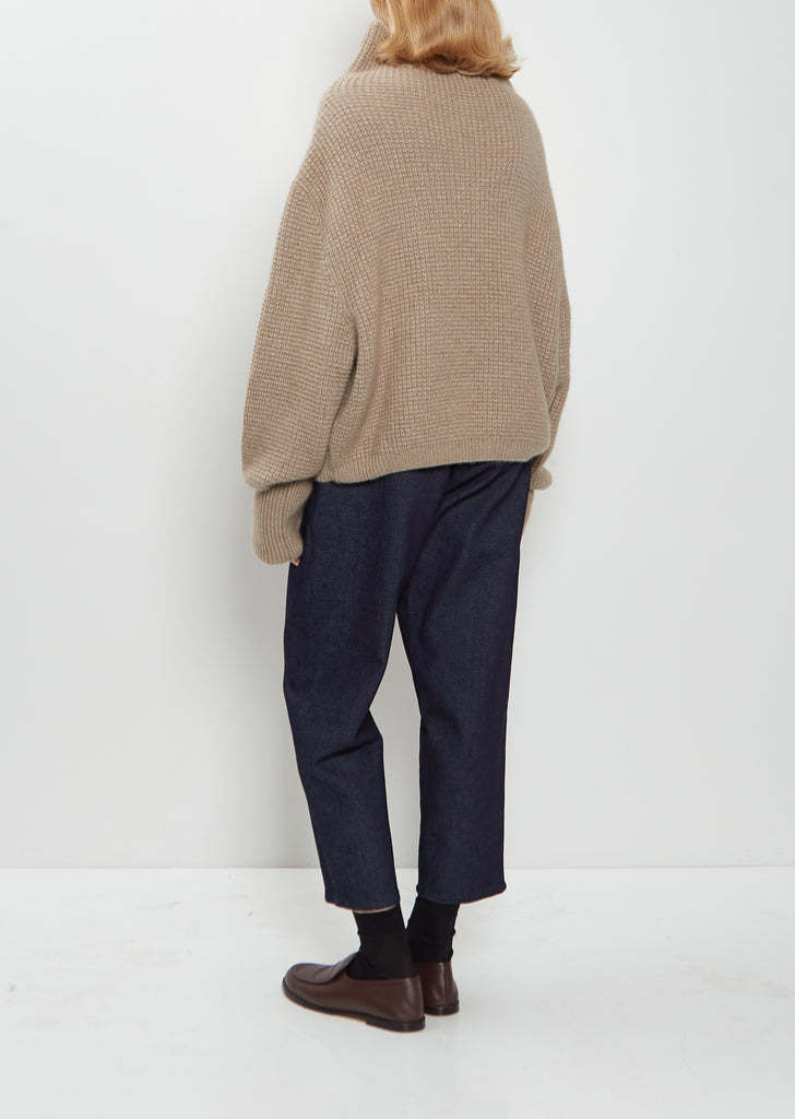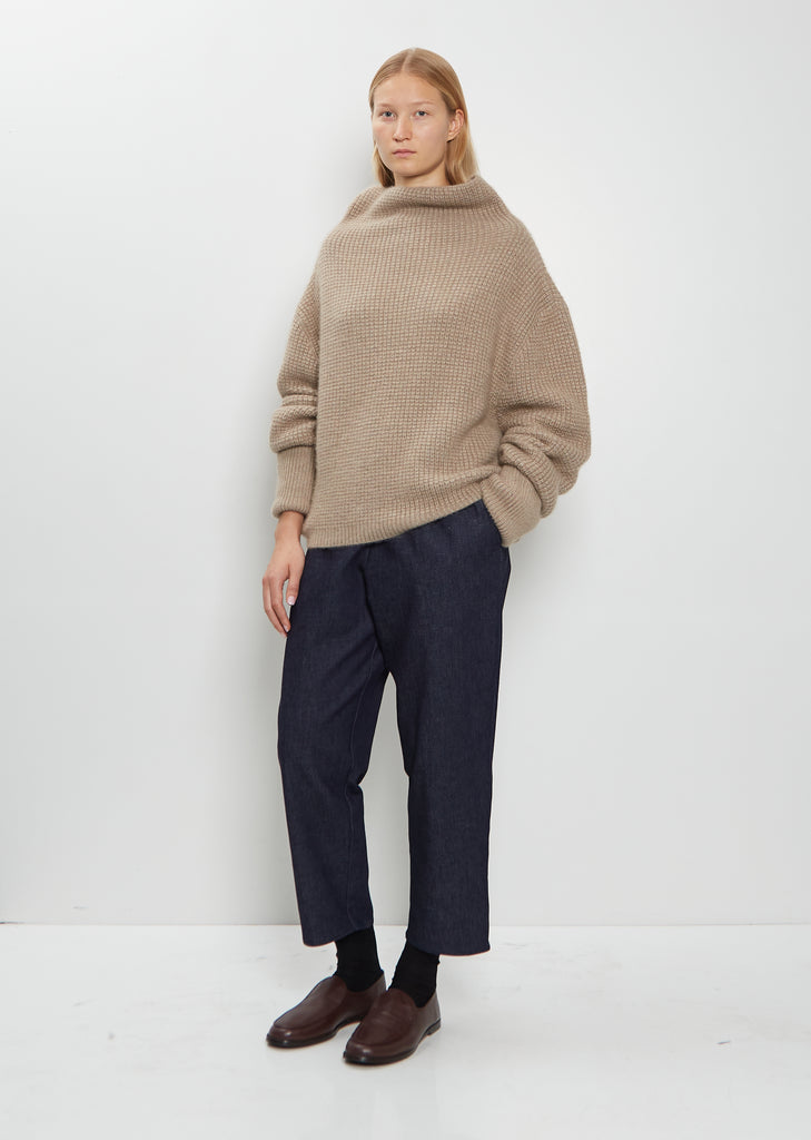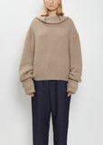 Dušan light brown white sweater with a mock neckline and elongated sleeves in an ultra-soft mid-weight cashmere knit. Features dropped shoulders, cuffed sleeves, and ribbed trim finishings at cuffs and hem. Relaxed, oversized fit.