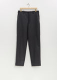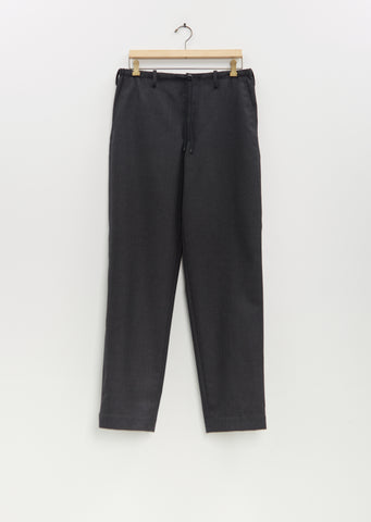 Dries Van Noten dark grey pull on pant with tapered legs and an elasticated drawstring waistband in a tropical wool. Features belt loops, angled front pockets, and a single buttoned patch pocket at back. Finished with a concealed zip fly and single horn hued button.