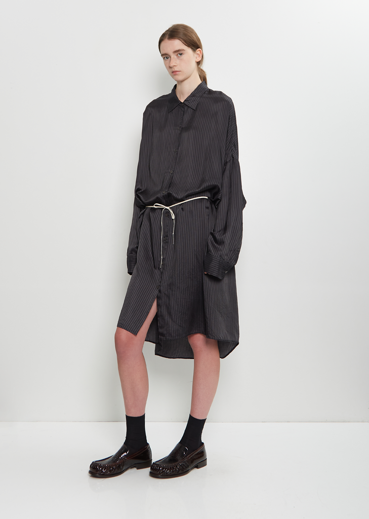 Dries Van Noten grey striped shirt dress with an off-white shoe lace drawstring waist in soft and smooth cupro. Features a classic collar, dropped shoulders, buttoned cuffs, silver-toned aglets at drawstring, curved back yoke, elongated back hem, and tonal button front.