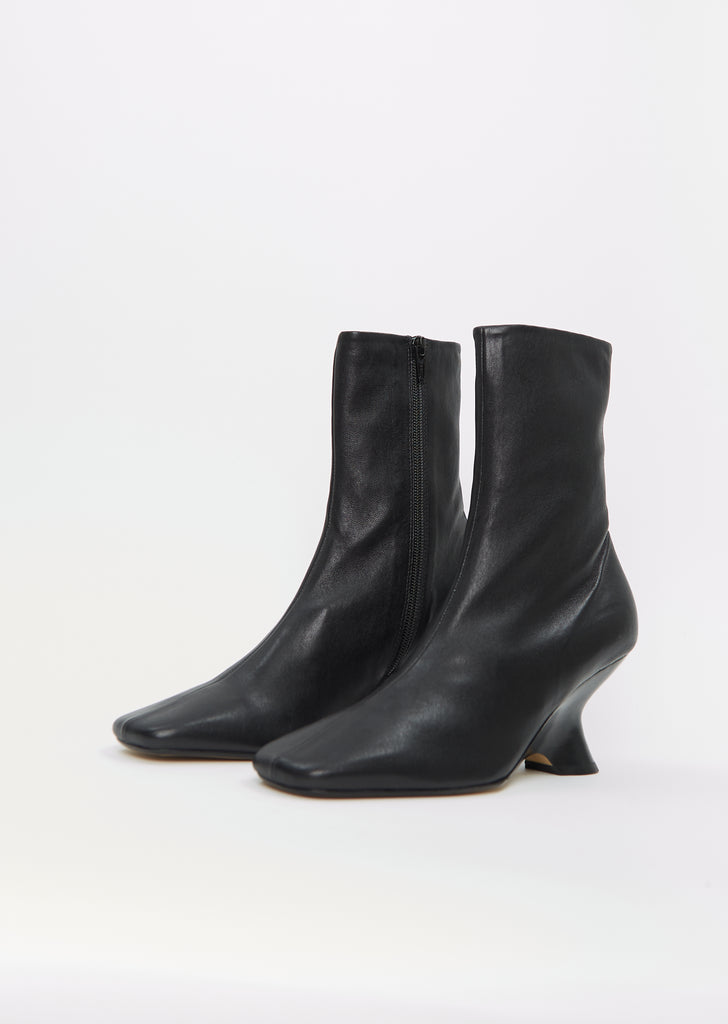 Dries Van Noten black heeled ankle boot with a tonal side zipper and split almond toe in soft lamb leather. Features a sculptural angled stacked heel and leather sole.