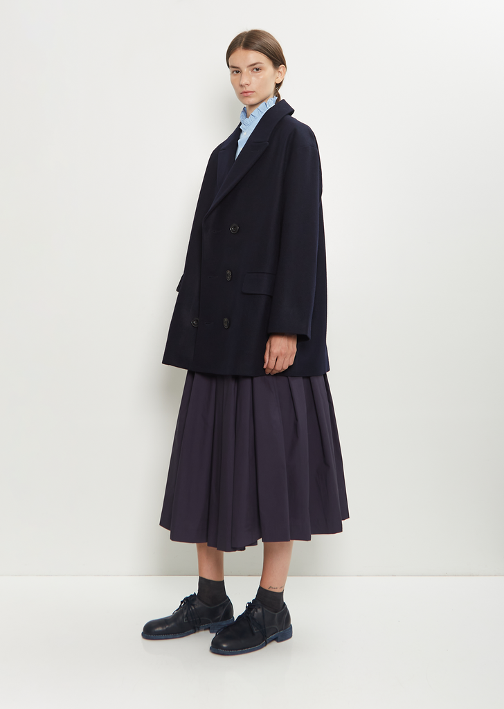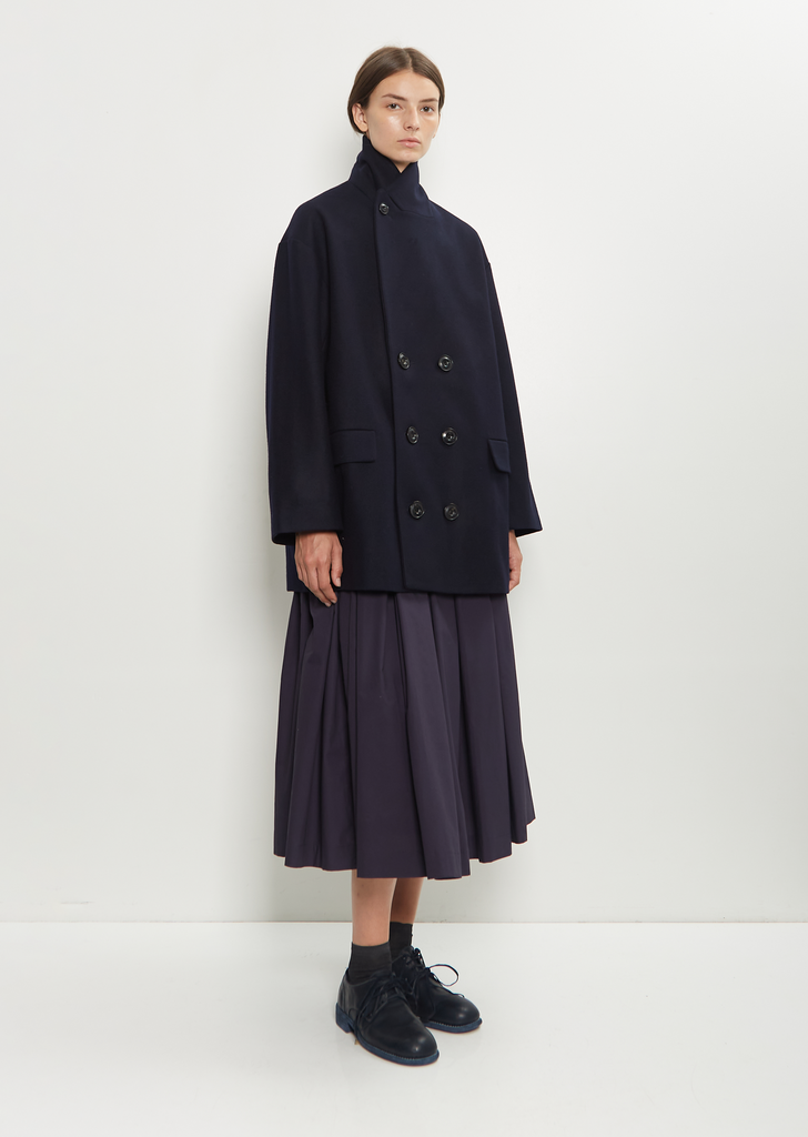 École de Curiosités dark navy double-breasted coat with sharp notched lapels and eight shell-hued buttons closure at front in mid-weight loden wool. Features dropped shoulders, wide sleeves and flap pockets. Lined in a tonal viscose and cotton blend twill.