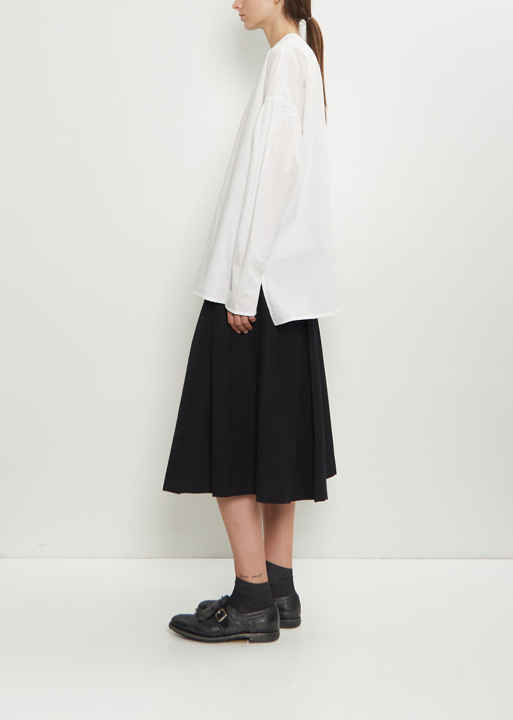 École de Curiosités off-white collarless shirt with gathered sleeves and dropped shoulders in crisp cotton fabric with a paper-like texture. Features a round neckline, a straight hem with side slits, and a vintage glass buttons closure at front.