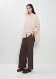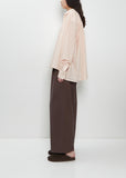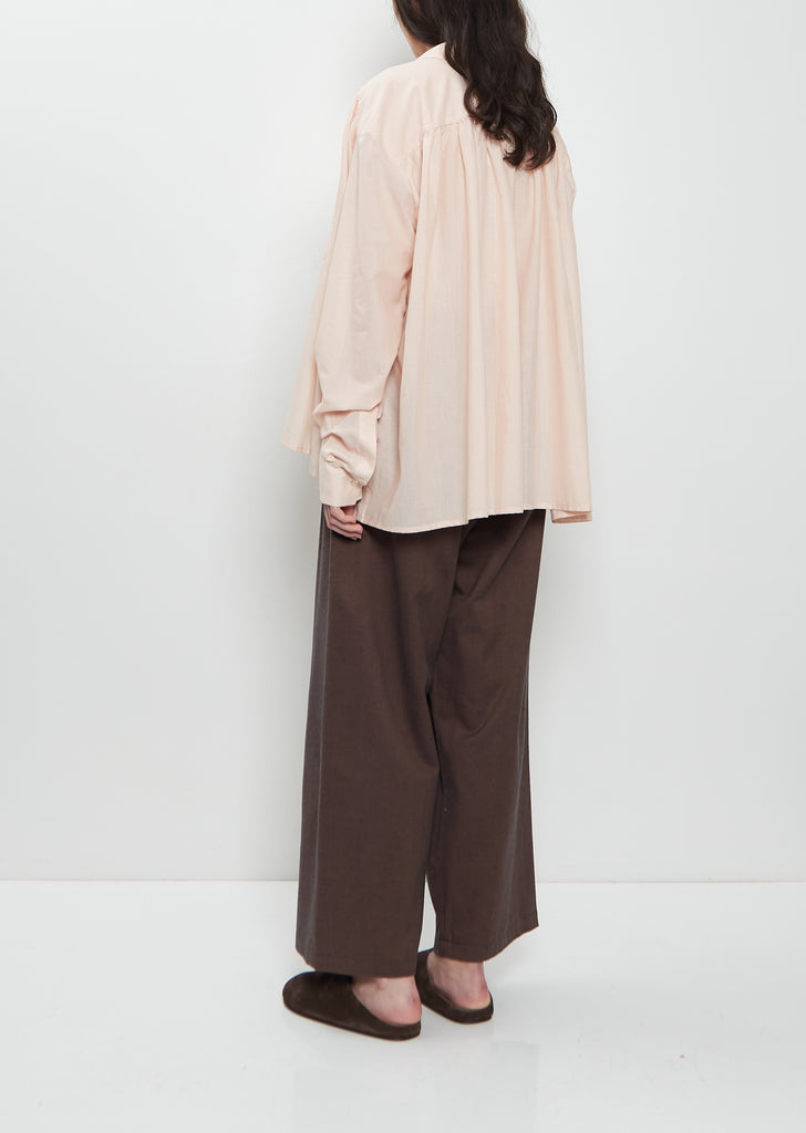 Eleph peach striped blouse with a classic collar and gathering along front and back yoke in a lightweight cotton cashmere blend. Features dropped shoulders, buttoned cuffs, and mother-of-pearl button front.