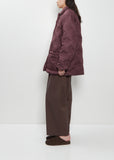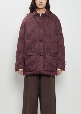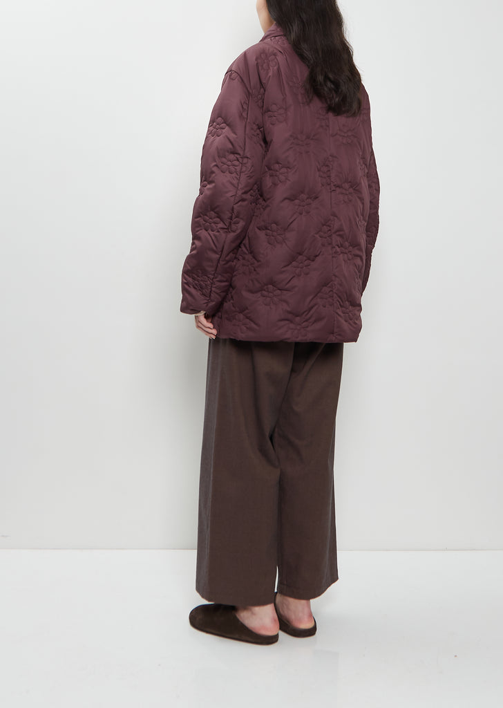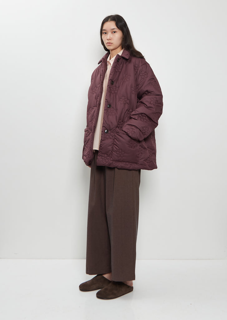 Eleph burgundy padded coat with a classic collar and horn-hued button front in a technical fabric with embroidered floral motifs throughout. Features dropped shoulders, front patch pockets, and an interior slip pocket. Lined in self. Boxy, voluminous fit.