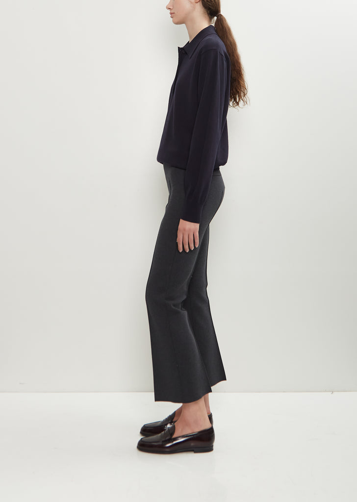 High Sport charcoal cropped pull-on pant with slightly flared legs in soft knit. Features an elasticated waistband, pintucks at front and back legs and two faux welt pockets at back.