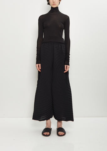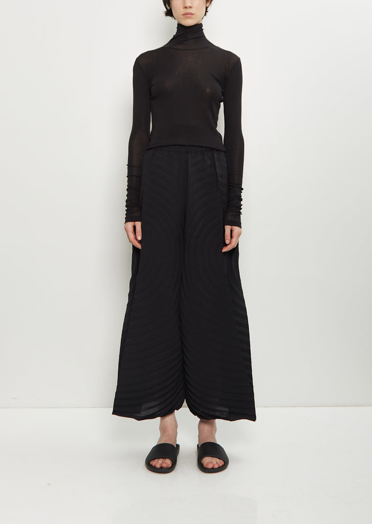 Issey Miyake black pull-on pant with a gusset design and wide legs in a circular hand-pleated smooth fabric. Features pintucks at legs and side seam pockets.