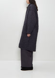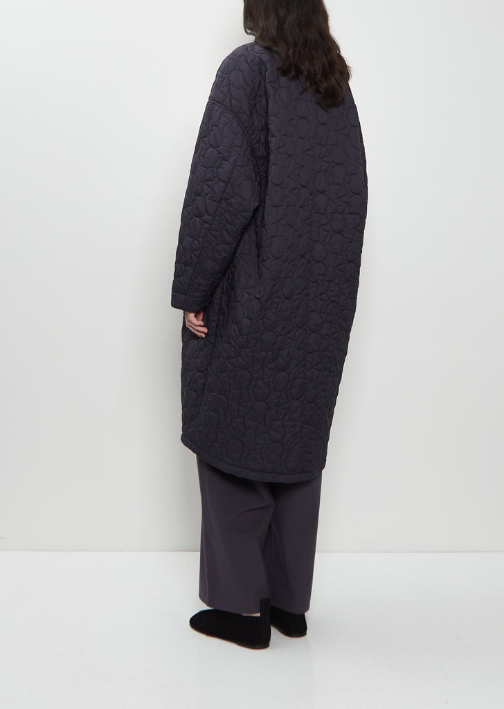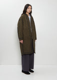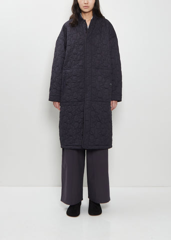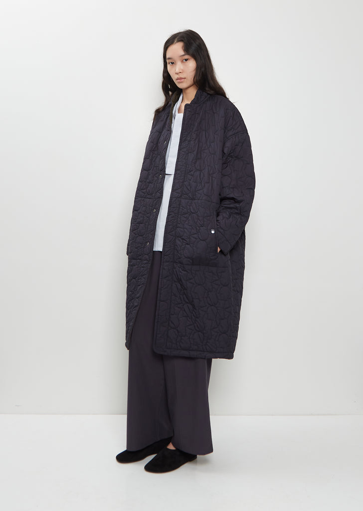 Konrad navy reversible coat made from a light quilted cotton and recycled polyamide blend with a khaki tone on reverse side. Features a stand collar, dropped shoulders, press button pockets at navy side, slip pockets at floral side, and a concealed press button front. Padding crafted in recycled cashmere and polyamide blend.