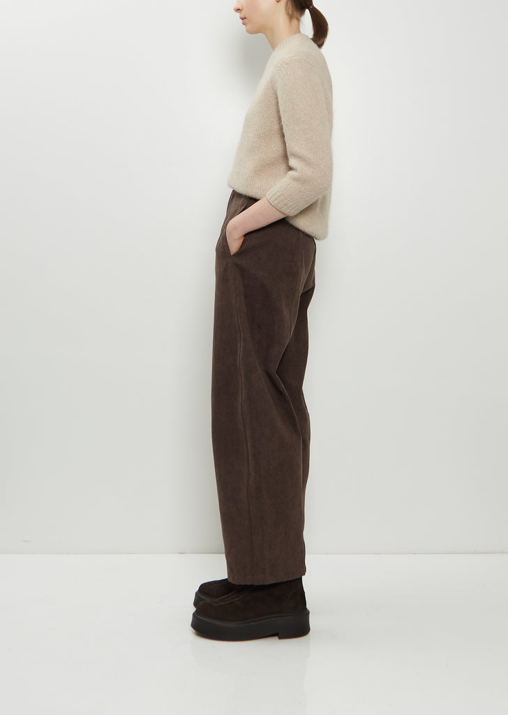 Lauren Manoogian brown high-waisted pants with wide, curved legs and adjustable button tab waist adjusters in mid-weight cotton canvas. Features side seam pockets, elasticated detail at back waist, darts at back, and button and zip-fly fastening.