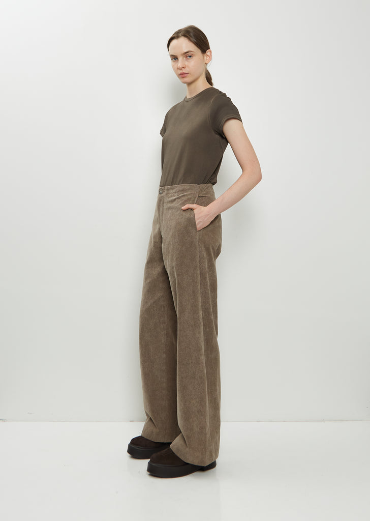 Lauren Manoogian washed khaki pants with wide, straight legs and half elasticated waist in cotton canvas. Features side seam pockets, darts at back, and button and zip-fly fastening.