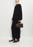 Marsèll signature top-handle bag in mini size in dark brown polished leather. Features cinched sides, top zip closure, side snaps for an adjustable shape, interior flap pockets, interior leather patch pockets and a single zip pocket. Optional crossbody strap included. Multiple carrying options.