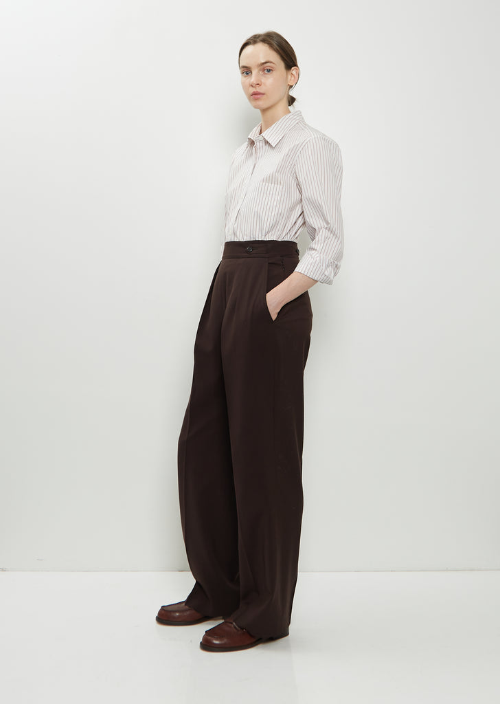 Margaret Howell dark brown straight leg high waisted trousers with a pull-through double tab side fastening and two front pleats in a lightweight wool flannel. Features angled front pockets and concealed side zip fastening. Regular fit.