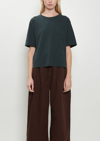 MHL by Margaret Howell algae green signature short sleeve t-shirt with a crew neckline and dropped shoulders in a lightweight cotton and linen blend jersey. Features split side seam details at hem and a rib trim finish at neckline. Boxy, relaxed fit.