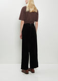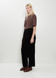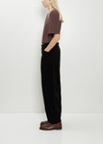 MHL by Margaret Howell black trouser with wide, straight legs in heavyweight cotton corduroy. Features front angled pockets, deep stitch-through hems, a notched waist detail at back, patch pockets at back, waist adjuster at back, and a concealed hook and eye zip-fly fastening.