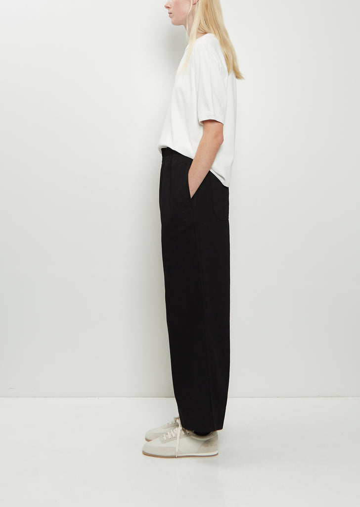 MHL by Margaret Howell black pull-on jogger with wide, straight legs and an elasticated waist in cotton denim twill. Features an interior adjustable drawstring at waist, side seam pockets, and patch pockets at back. Relaxed fit.