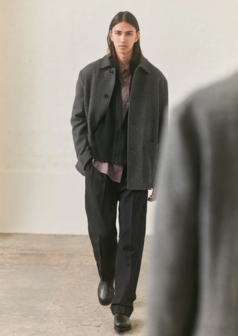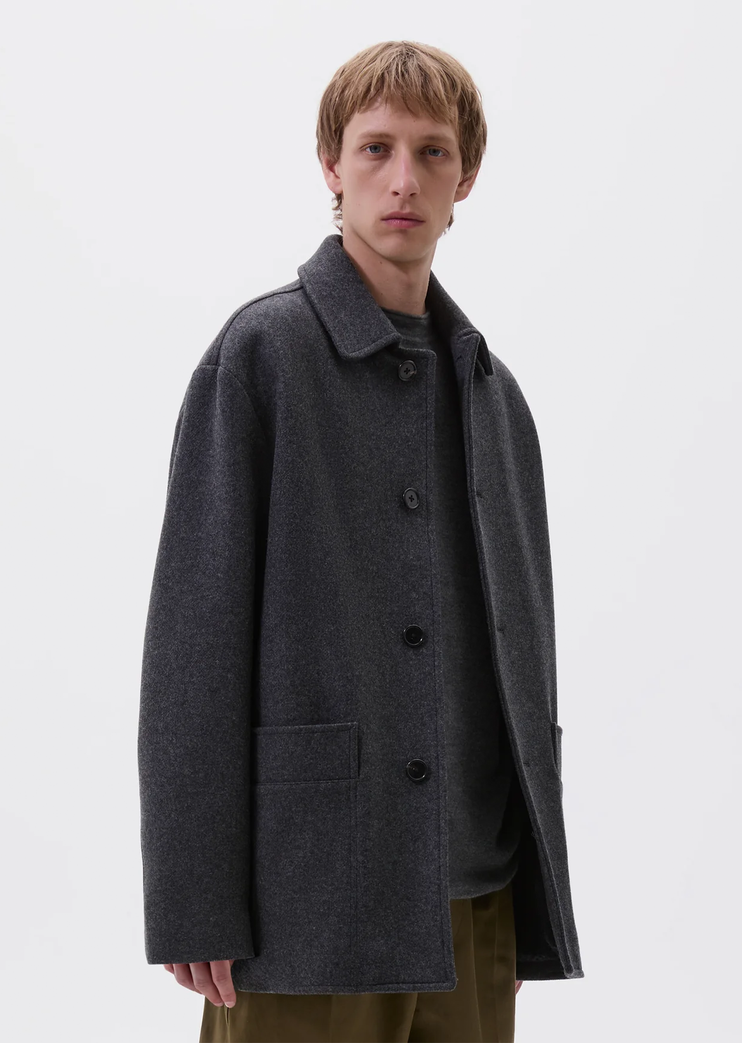 Margaret Howell charcoal car coat with a spread collar and horn-hued button front in mid-weight dense wool melton. Features dropped shoulders and front patch pockets. Lined in black wool cotton fleece. Relaxed fit.
