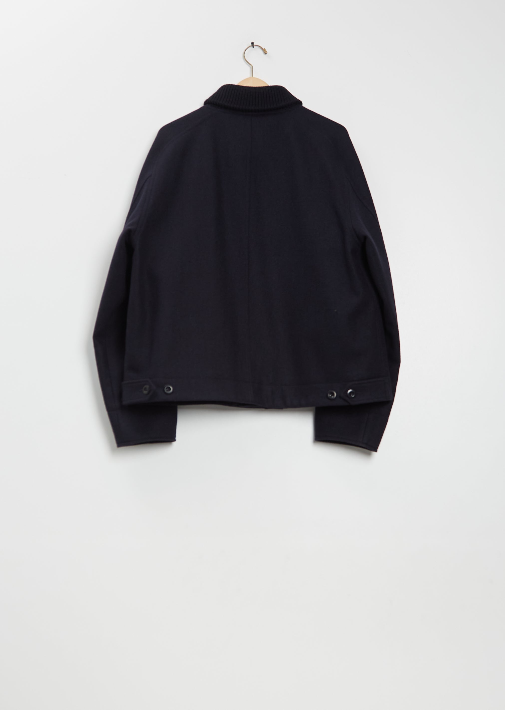 MHL by Margaret Howell ink jacket with a ribbed knit collar that can be worn up or down in wool melton. Features saddle shoulders, front zip patch pockets with side entry, button tab waist adjusters, an interior slip pocket, and a concealed double zip fastening with button at top and hem. Lined in black cotton twill. Relaxed fit.