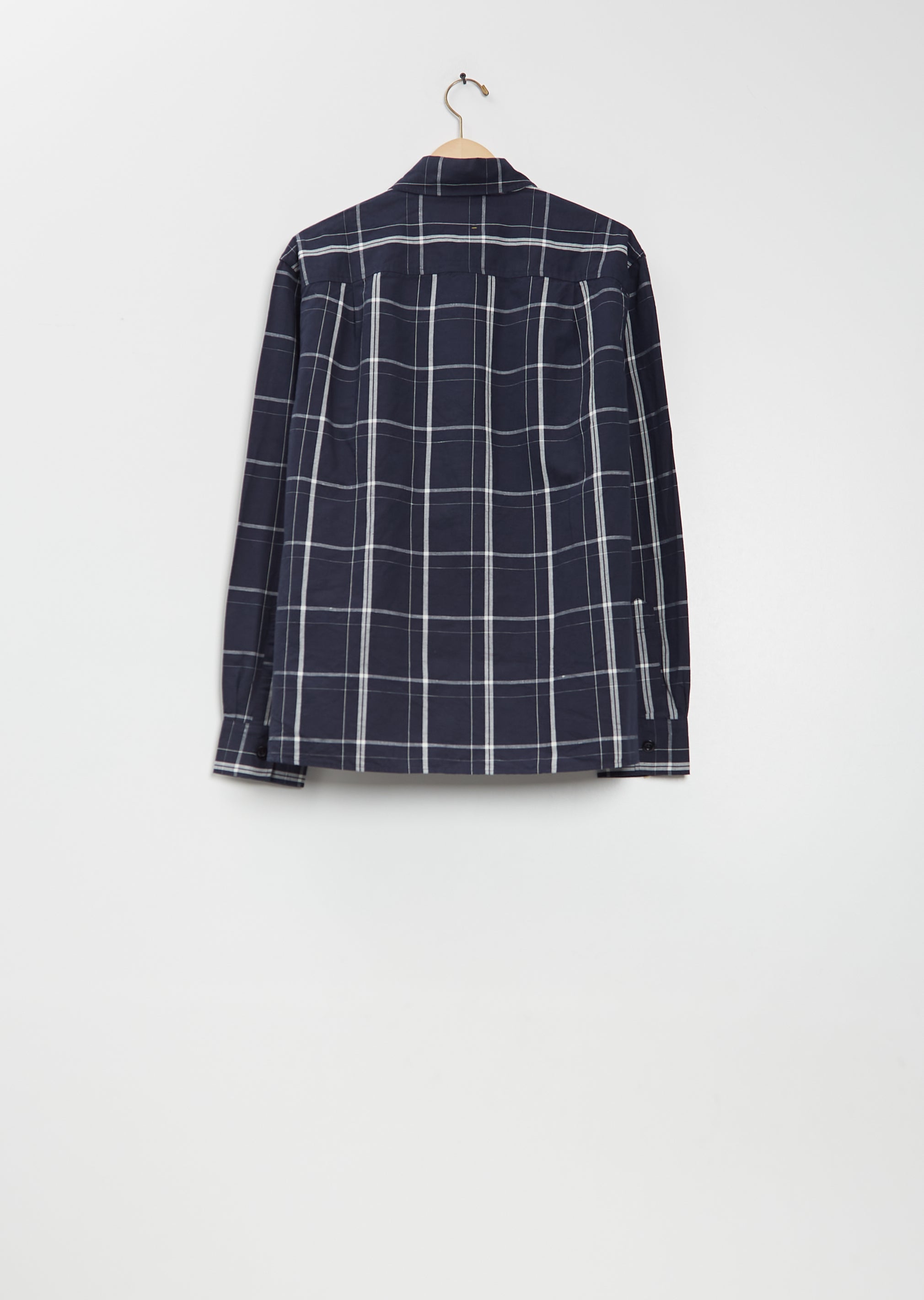 MHL by Margaret Howell blue and white plaid shirt with a classic collar and raised black button placket in cotton plainweave. Features a large buttoned chest patch pocket, buttoned cuffs, side gusset details, and two box pleats at back yoke. Relaxed, boxy fit.