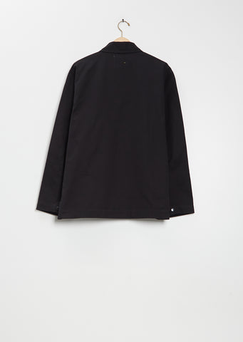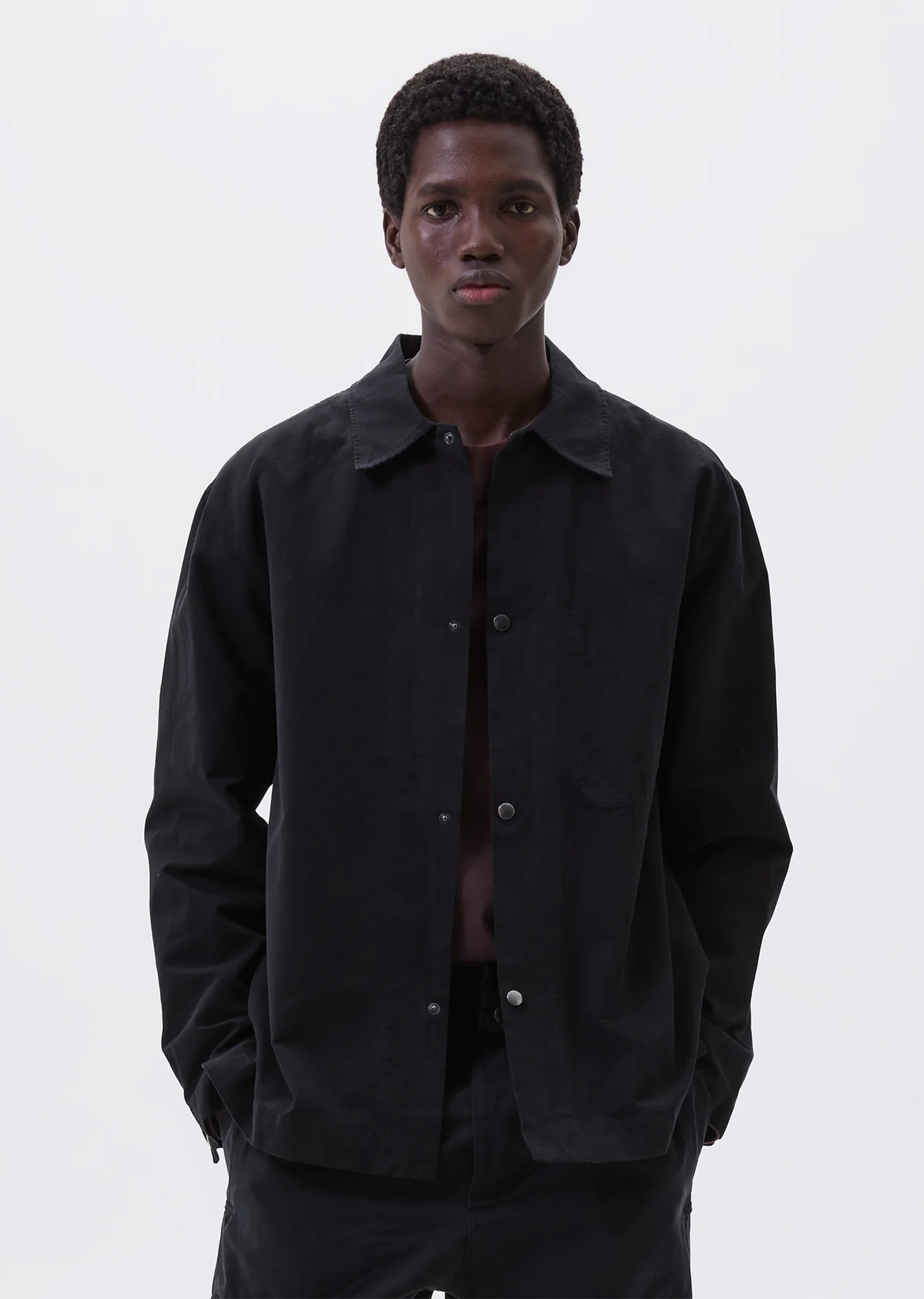 MHL by Margaret Howell black shirt with a classic collar and press button front in cotton canvas. Features dropped shoulders, adjustable press button cuffs, split side seams with herringbone tape detailing, and an interior patch pocket. Can be worn as a shirt or jacket. Relaxed fit.