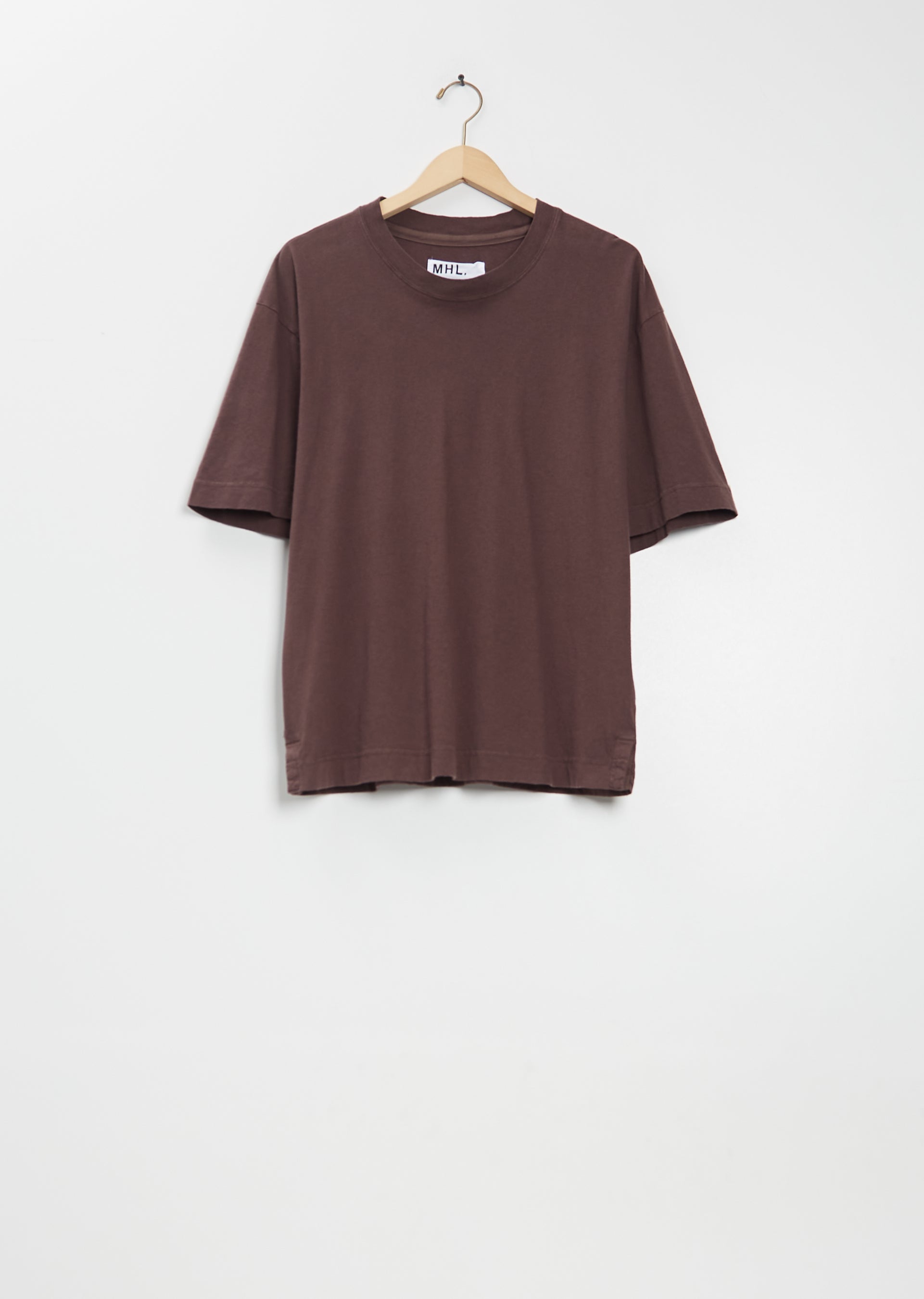 MHL by Margaret Howell brown signature short sleeve t-shirt with a crew neckline and dropped shoulders in a lightweight cotton and linen blend jersey. Features split side seam details at hem and a rib trim finish at neckline. Boxy, relaxed fit.