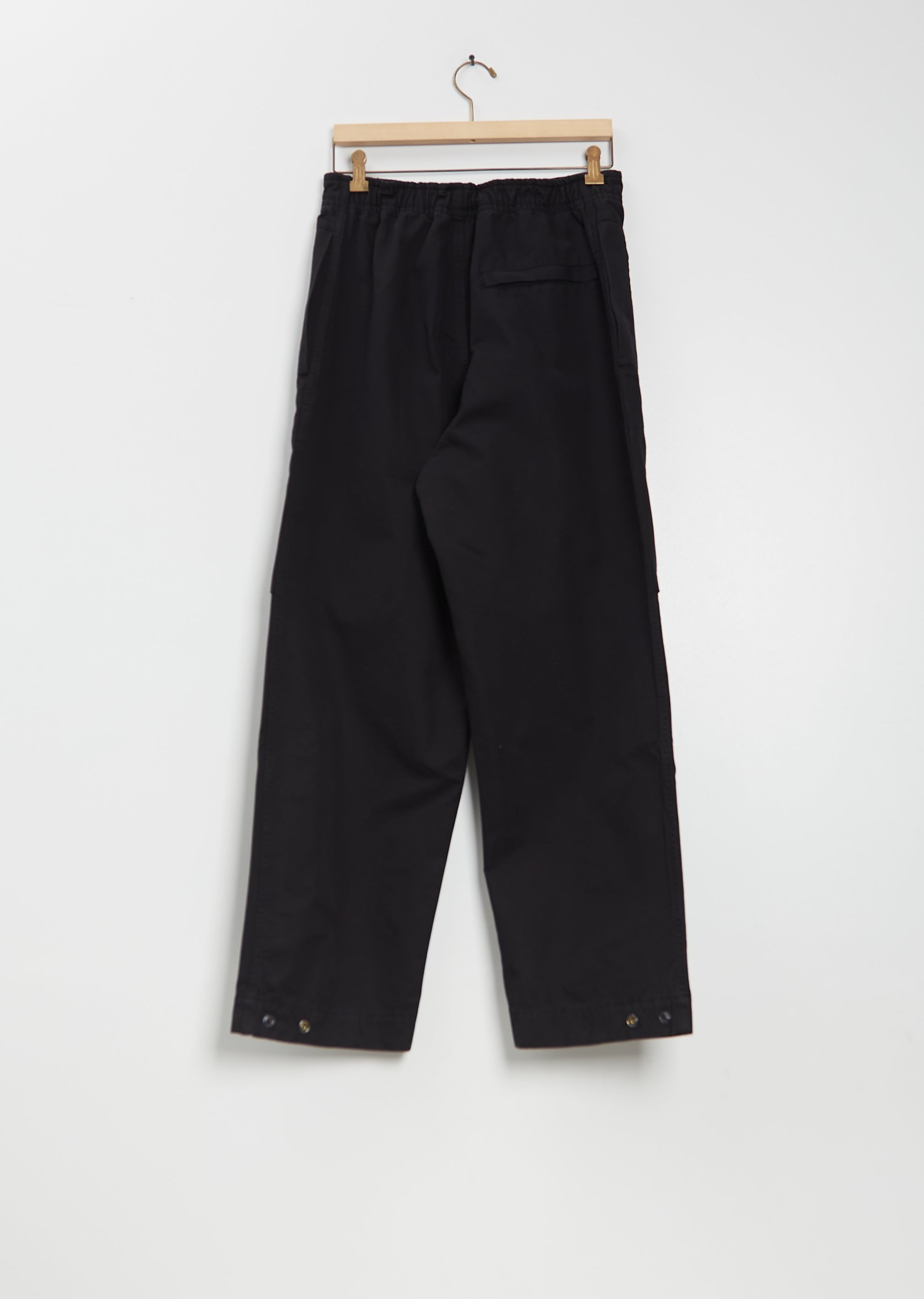 MHL by Margaret Howell black trousers with wide, slightly tapered legs and elasticated waist in cotton canvas. Features side seam pockets, pleats at knees, adjustable press button cuffs, a zippered welt pocket at back, two press button and concealed button-fly fastening. Relaxed fit.