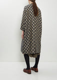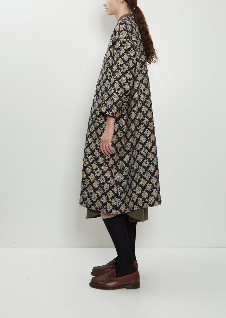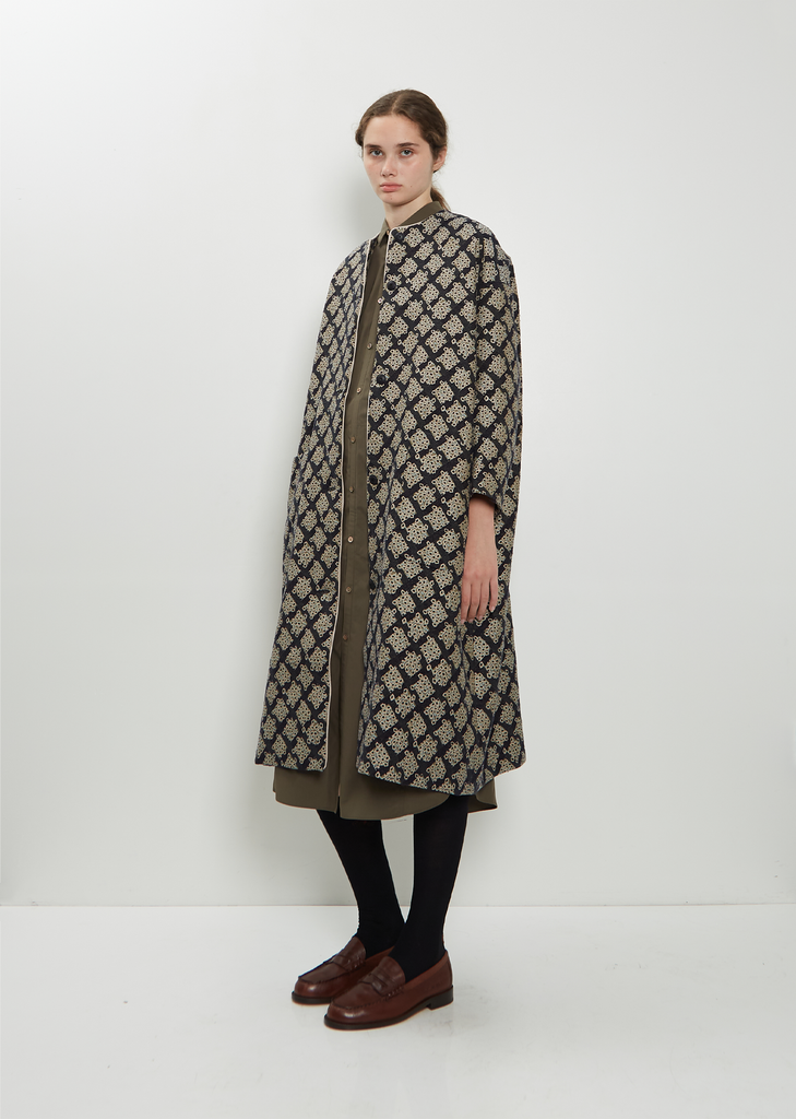 Minä Perhonen light beige and navy collarless single-breasted coat with light beige piping detail at opening in a luxurious cotton, wool and silk jacquard with a floral motif. Features dropped shoulders, 3/4 sleeves, deep patch pockets, a high slit at back and a tonal buttons closure at front. Finished with a hanging loop at inner neck. Fully lined in light beige satin.