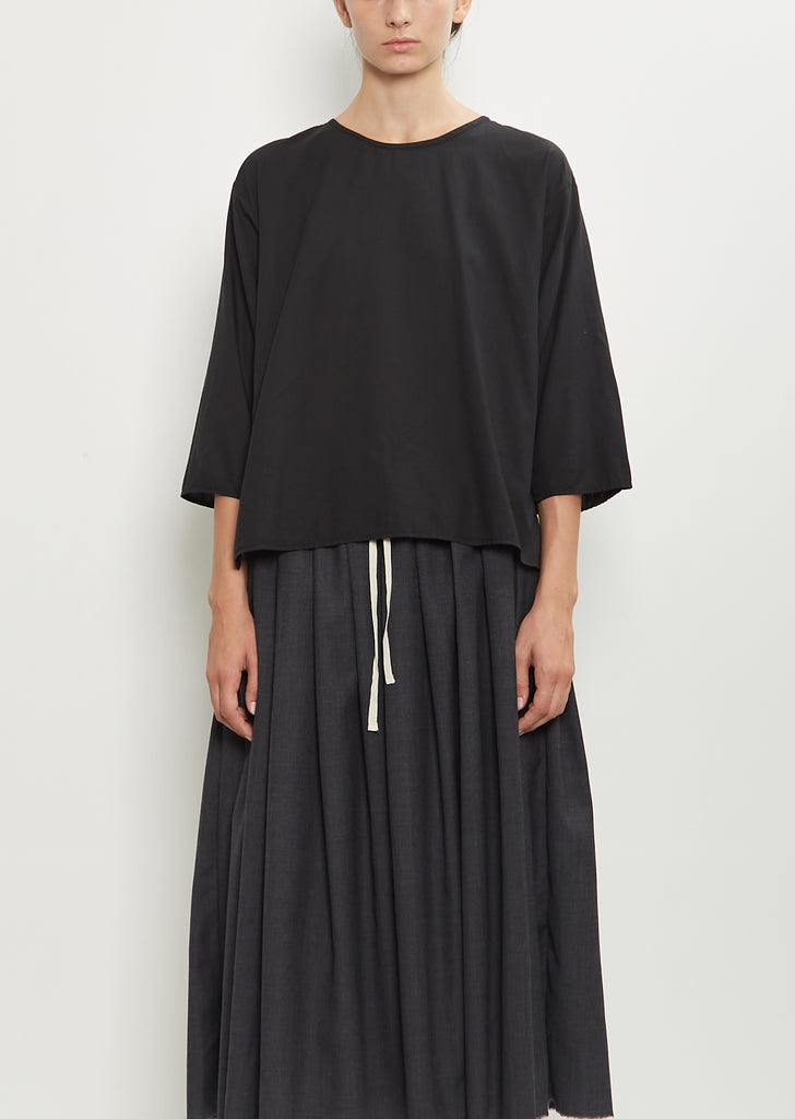 Nitto black blouse with a round neckline and 3/4 length sleeves in a lightweight and sift Italian cotton flannel. Features dropped shoulders, split side seams, a mother-of-pearl buttoned keyhole at back neck, and a signature embroidered detail at back neck. Boxy fit.
