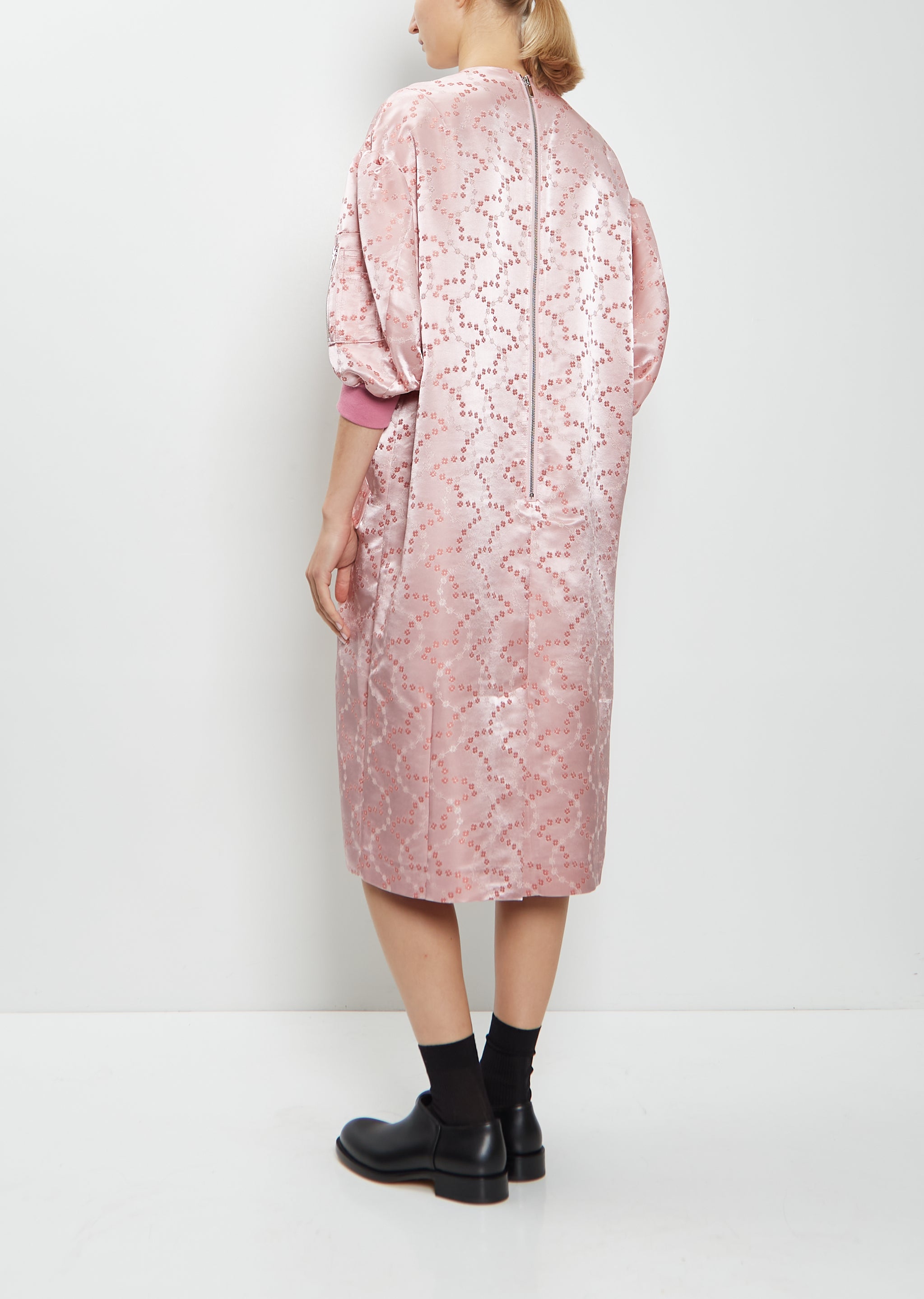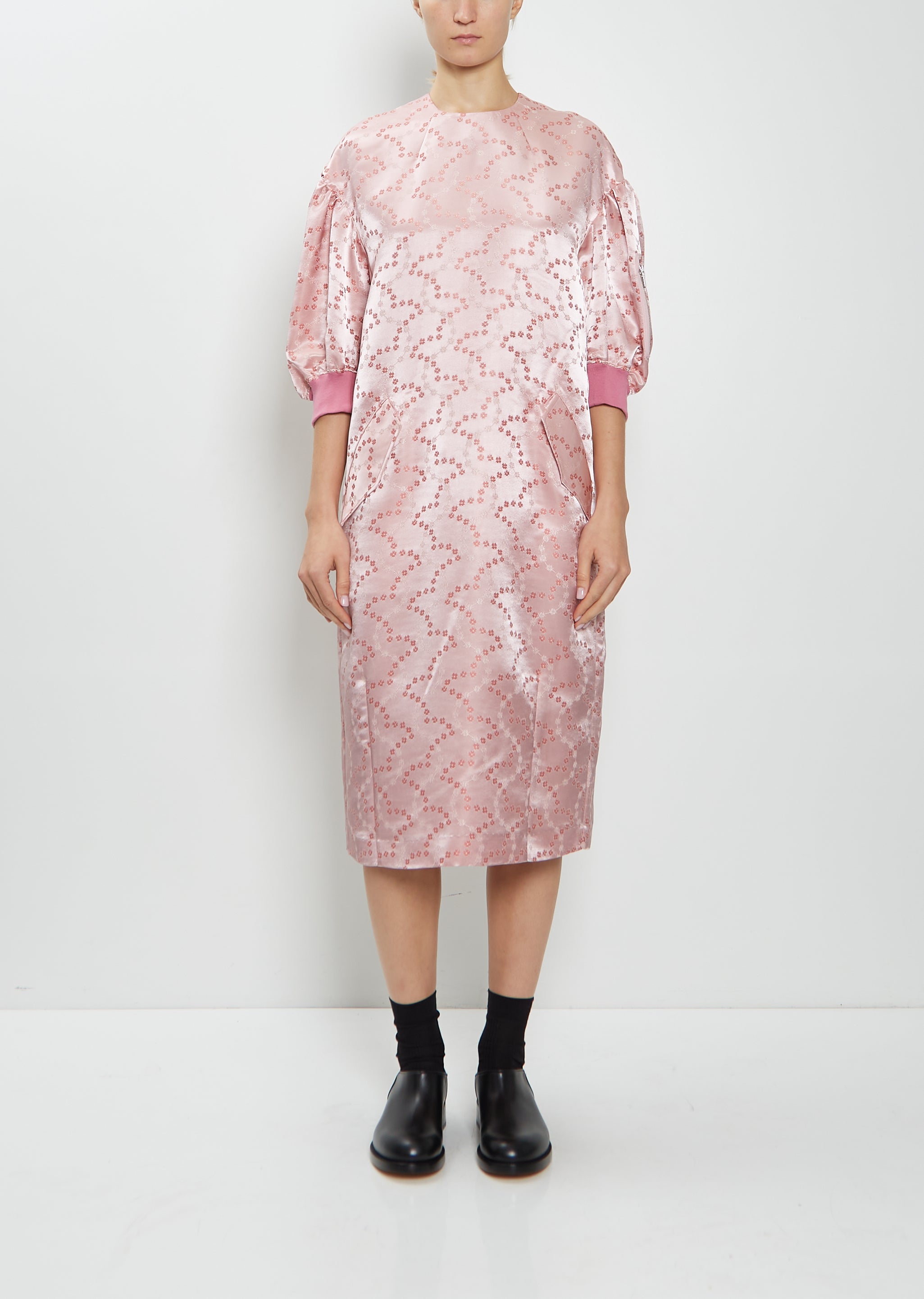 Noir by Kei Ninomiya pullover dress with puffed sleeves and contrasting elasticated ribbed cuffs in a smooth satin with an embroidered floral pattern. Features a round neckline, dropped shoulders, half puffed sleeves, flap angled pockets, zippered pocket at left sleeve, darts at bottom hem, a back slit and a silver-hued zipper closure at back. Relaxed fit.