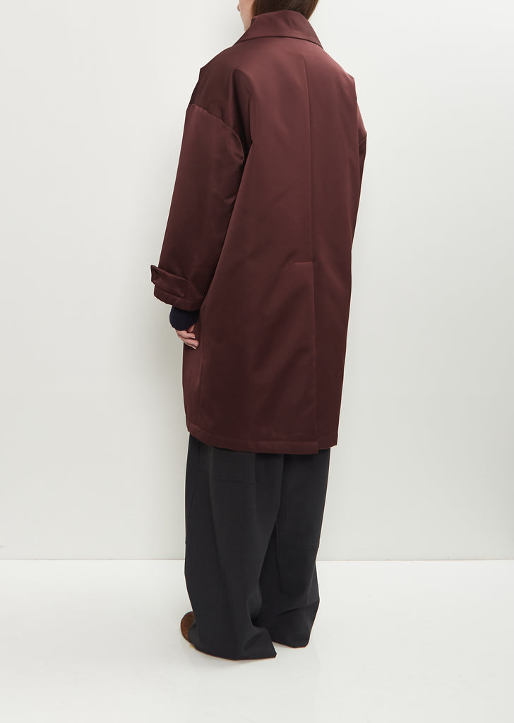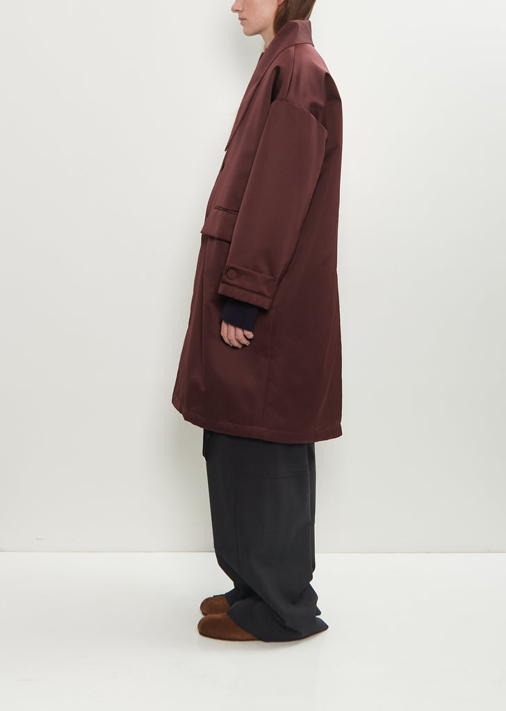 Plan C dark burgundy coat with a detachable pointed shawl collar and tonal fabric button front in padded dense duchesse satin. Features a round neckline, dropped shoulders, front flap welt pockets, adjustable button tab cuffs, and a vent at back. Lined in tonal cupro. Relaxed fit.