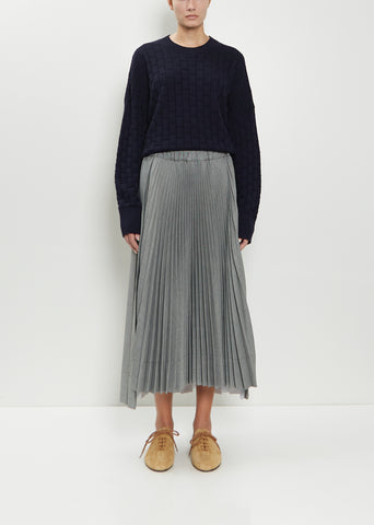 Plan C black and white asymmetrical A-line pull-on skirt with an elasticated waistline in a pleated virgin wool blend. Features concealed seam pockets and asymmetrical hem.