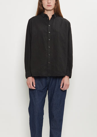 Pas de Calais black shirt with a mini collar and tonal button front in cotton with a crinkle effect. Features set-in sleeves, buttoned cuffs, curved hem, and a box pleat at back yoke.
