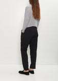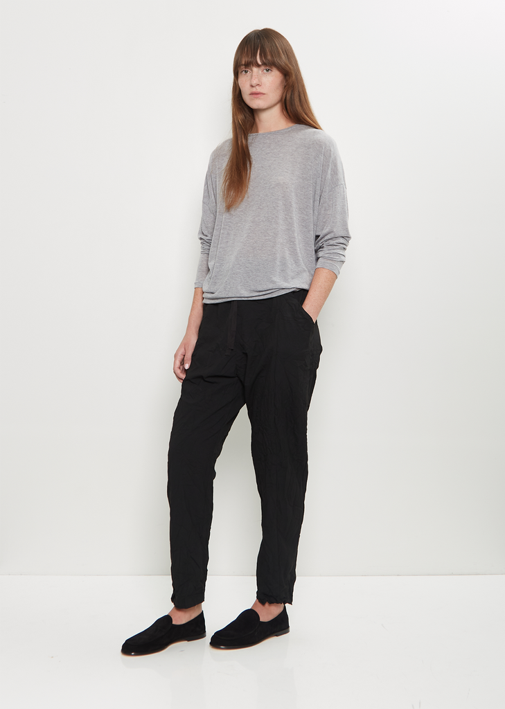 Pas de Calais black pull-on pant with tapered legs and an elasticated drawstring waist in a poly-blend fabric with a crinkle effect. Features angled front pockets. Relaxed fit.