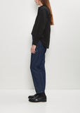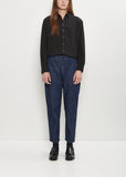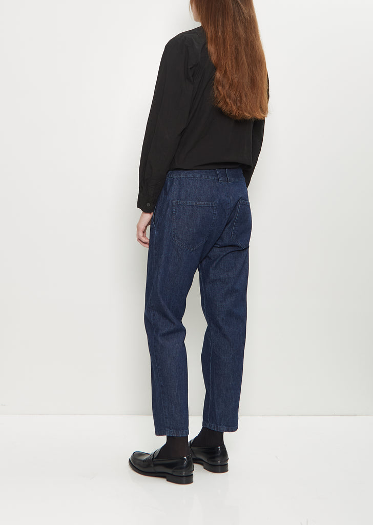Pas de Calais dark indigo pants with cropped, tapered legs and a two black button and zip-fly fastening in cotton denim. Features belt loops, angled front pockets, adjustable button tab details at waist, and patch pockets at back.
