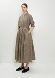 Pas de Calais brown and ivory checkered long sleeve dress with a band collar and pleated waist in soft washed cotton. Features a shell-hued button key hole at neck, dropped shoulders, adjustable drawstring at left waist, and side seam pockets.