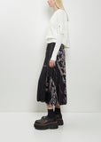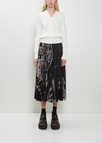 Sacai black paisley A-line wrap pleated skirt with a grosgrain belt and a rectangular silver-hued ring in technical satin. Features an interior tonal button fastening at side. Partially lined in tonal cupro.
