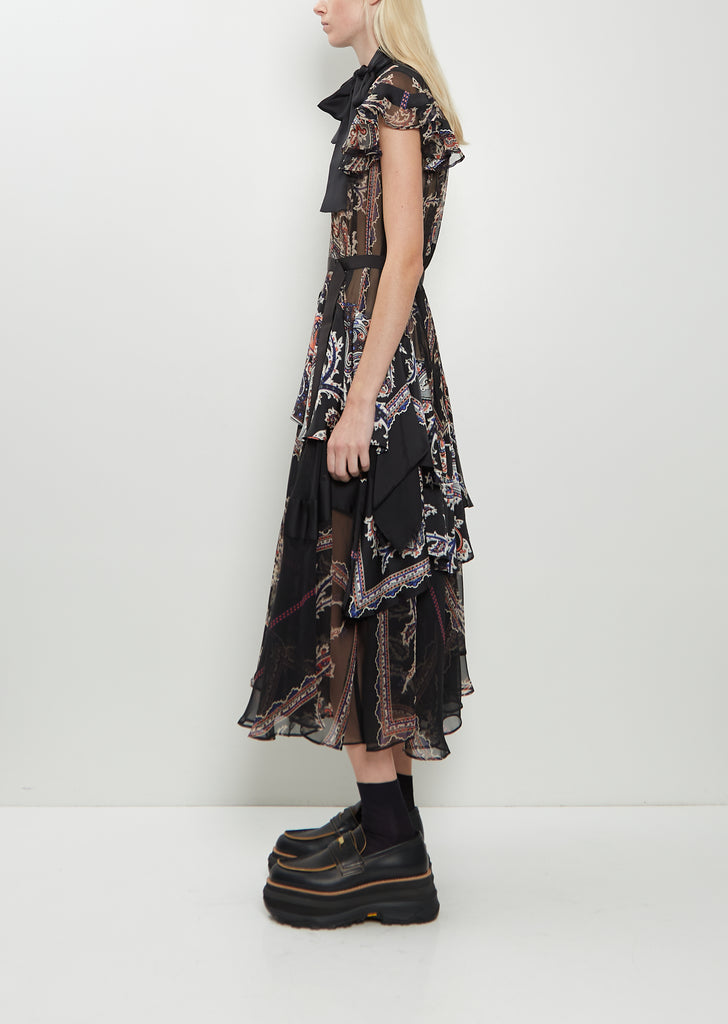 Sacai black dress with ruffled cap sleeves and tiered skirt in polyester with a paisley print throughout. Features a removable snood scarf, satin tie neckline, three button snap fastening at right neck, grosgrain details throughout, and an adjustable grosgrain belt at waist. Comes unlined.