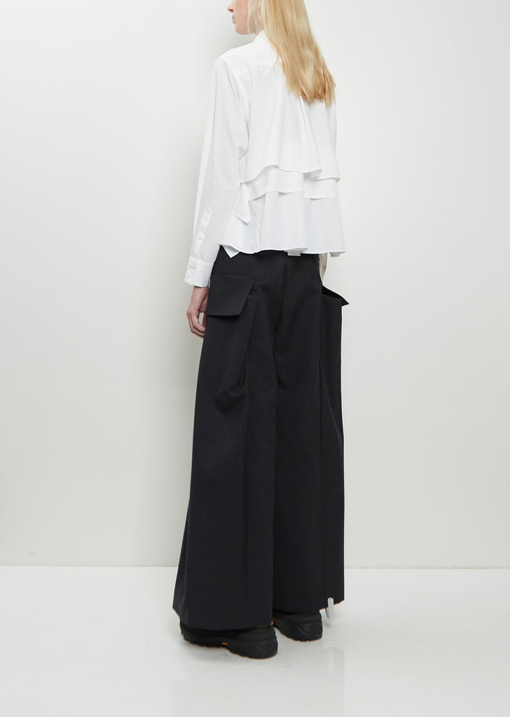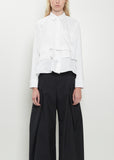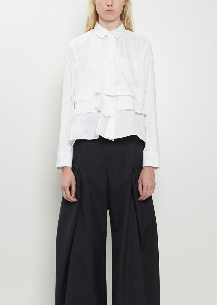 Sacai off white shirt with a classic collar and tiered handkerchief underlay details at hem in cotton poplin. Features a chest patch pocket, buttoned cuffs, split side seam details at attached tiers, box pleat at back yoke, and concealed button front with a single exposed button at neck.