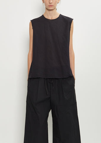 SCHA black sleeveless popover top with a round neckline in washed paper cotton. Features a V-neckline at back and stitched raw edge trim finishings at neckline, armhole and hems. Can also be worn back to front.